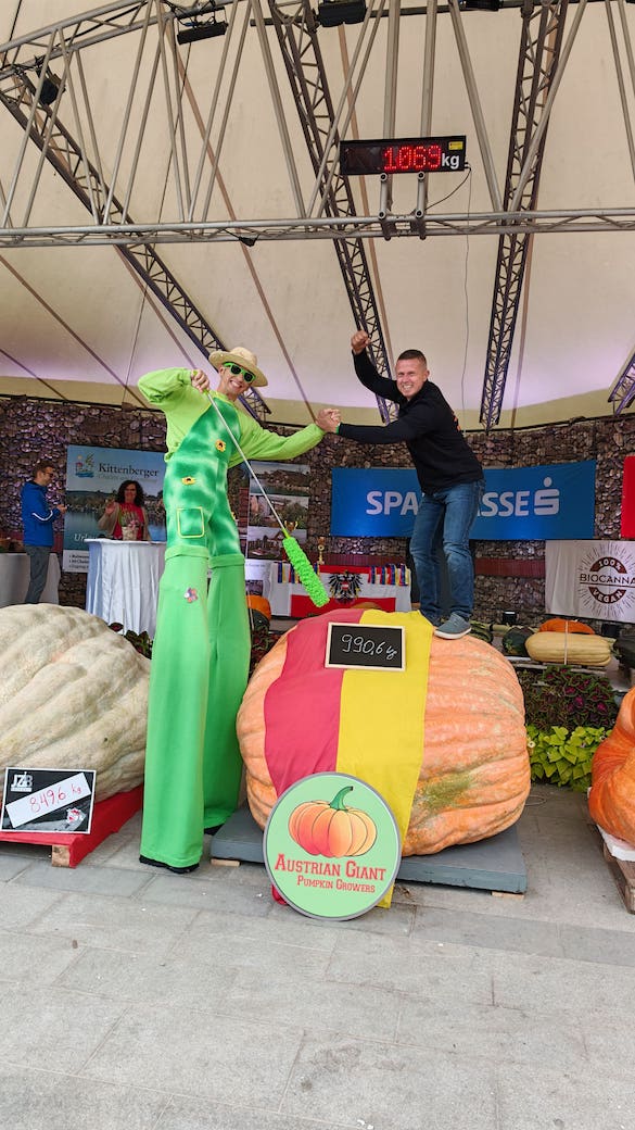 Wolfgang Nittnaus aus dem Burgenland krönte sich am 4. Oktober 2025 mit dem gewaltigen 990,6 Kilogramm schweren"Atlantic Giant"-Kürbis zum neuen Staatsmeister und hat somit den bisherigen Österreichrekord mit weit über 100 kg übertroffen.