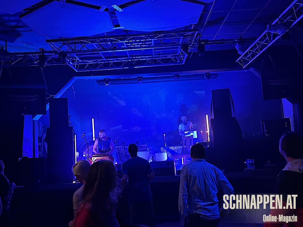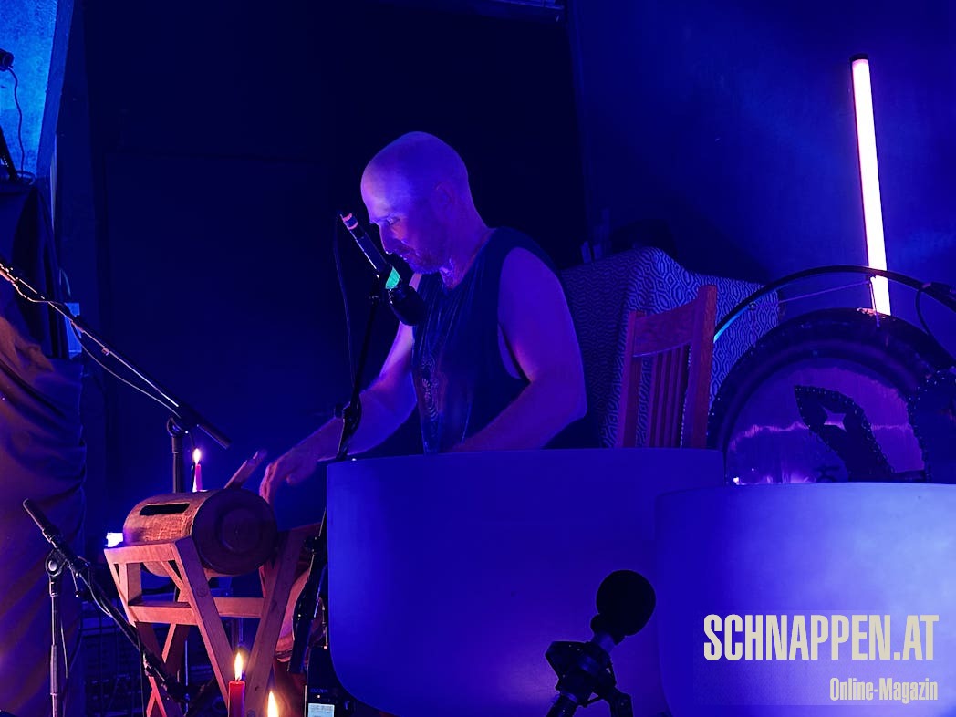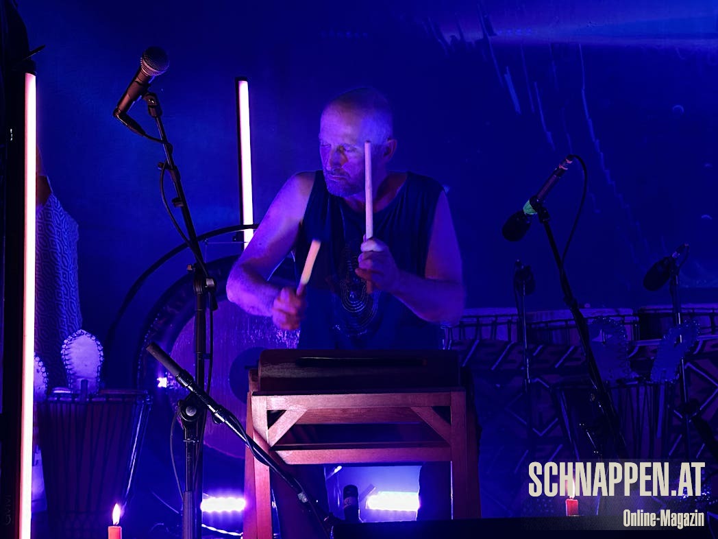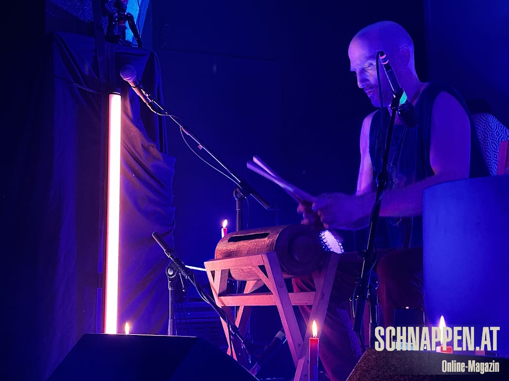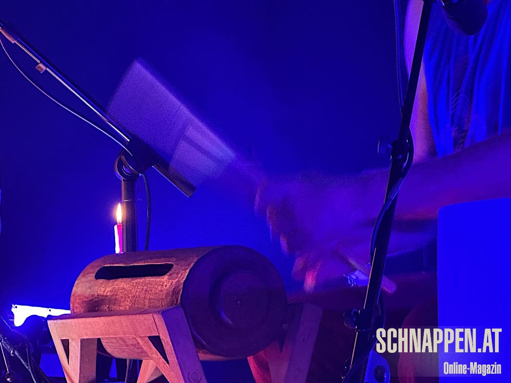 Bei der Musik von Abarga Soundsystem trifft sich elektronische Musik mit traditionellen akustischen Instrumenten. Die Bühne im Jazz Pub war voll mit Instrumenten wie Gongs, Handpan, Klangschalen, N'goni, Djemben, Kryin, Udu, Kamalen Goni, Fedoundoun, Singing Bowls, Springdrum und dem Monochord.