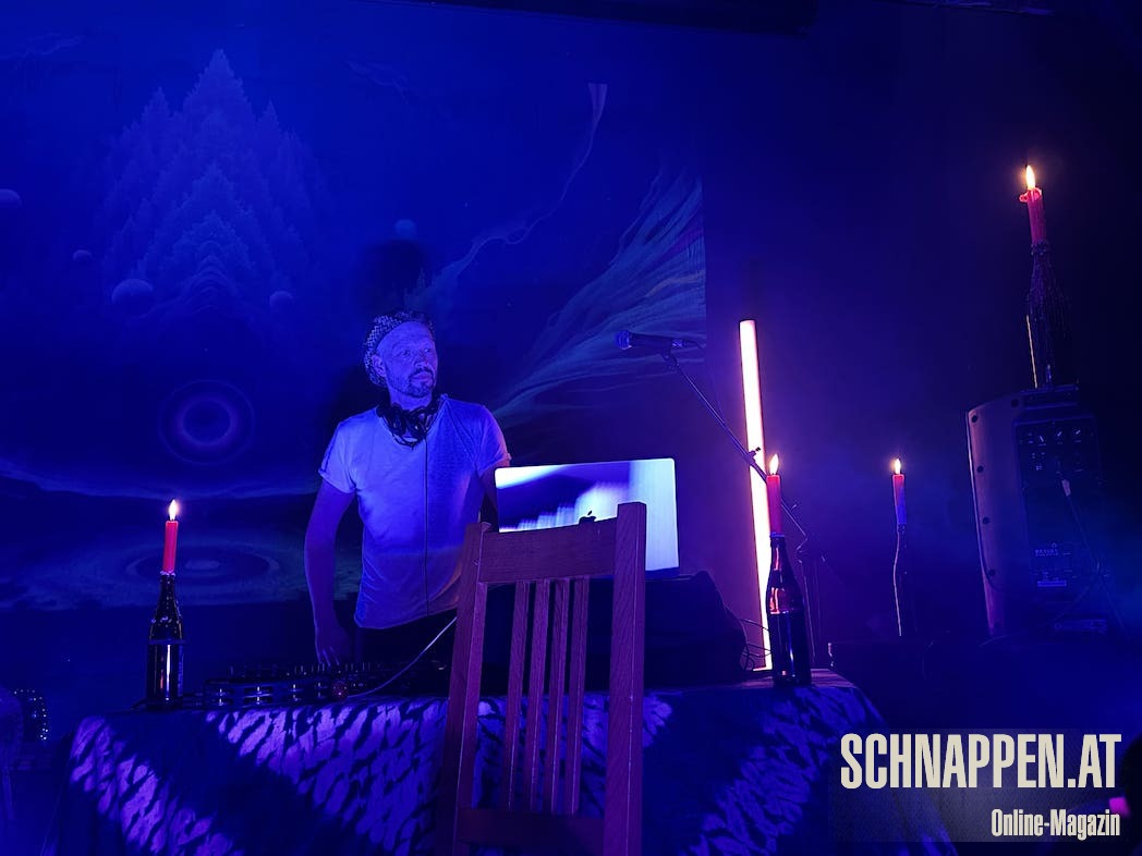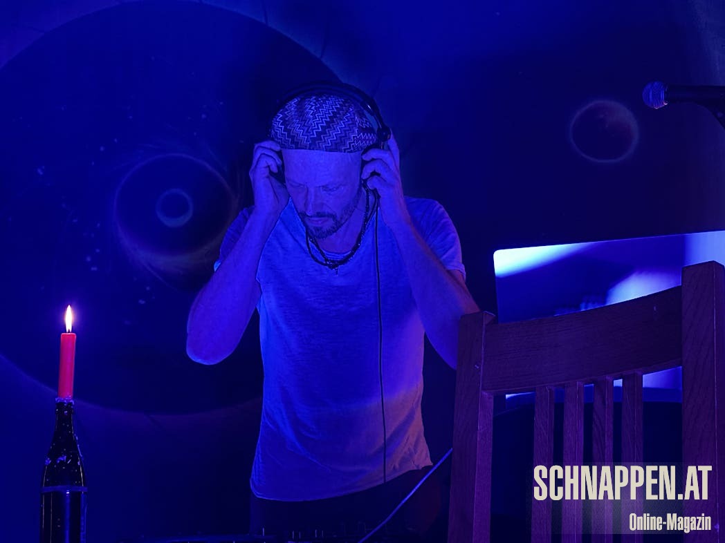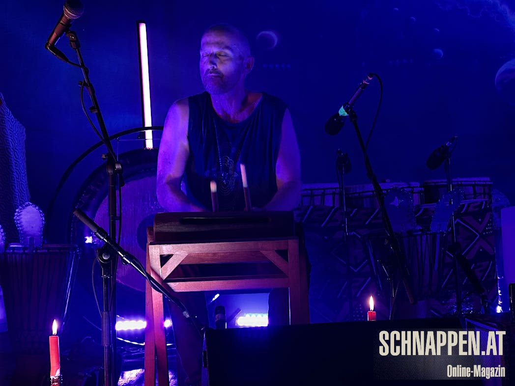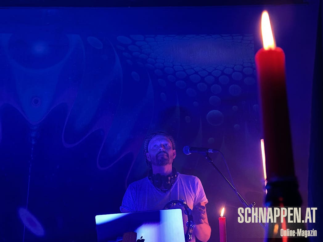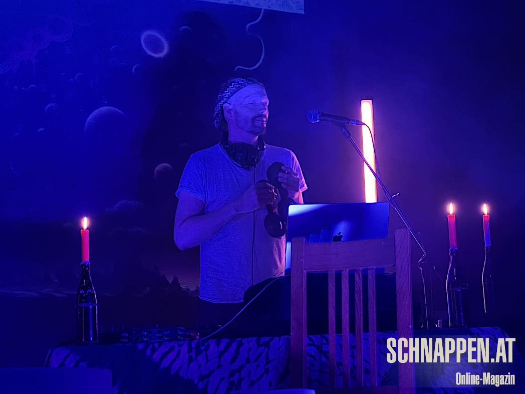 Bei der Musik von Abarga Soundsystem trifft sich elektronische Musik mit traditionellen akustischen Instrumenten. Die Bühne im Jazz Pub war voll mit Instrumenten wie Gongs, Handpan, Klangschalen, N'goni, Djemben, Kryin, Udu, Kamalen Goni, Fedoundoun, Singing Bowls, Springdrum und dem Monochord.