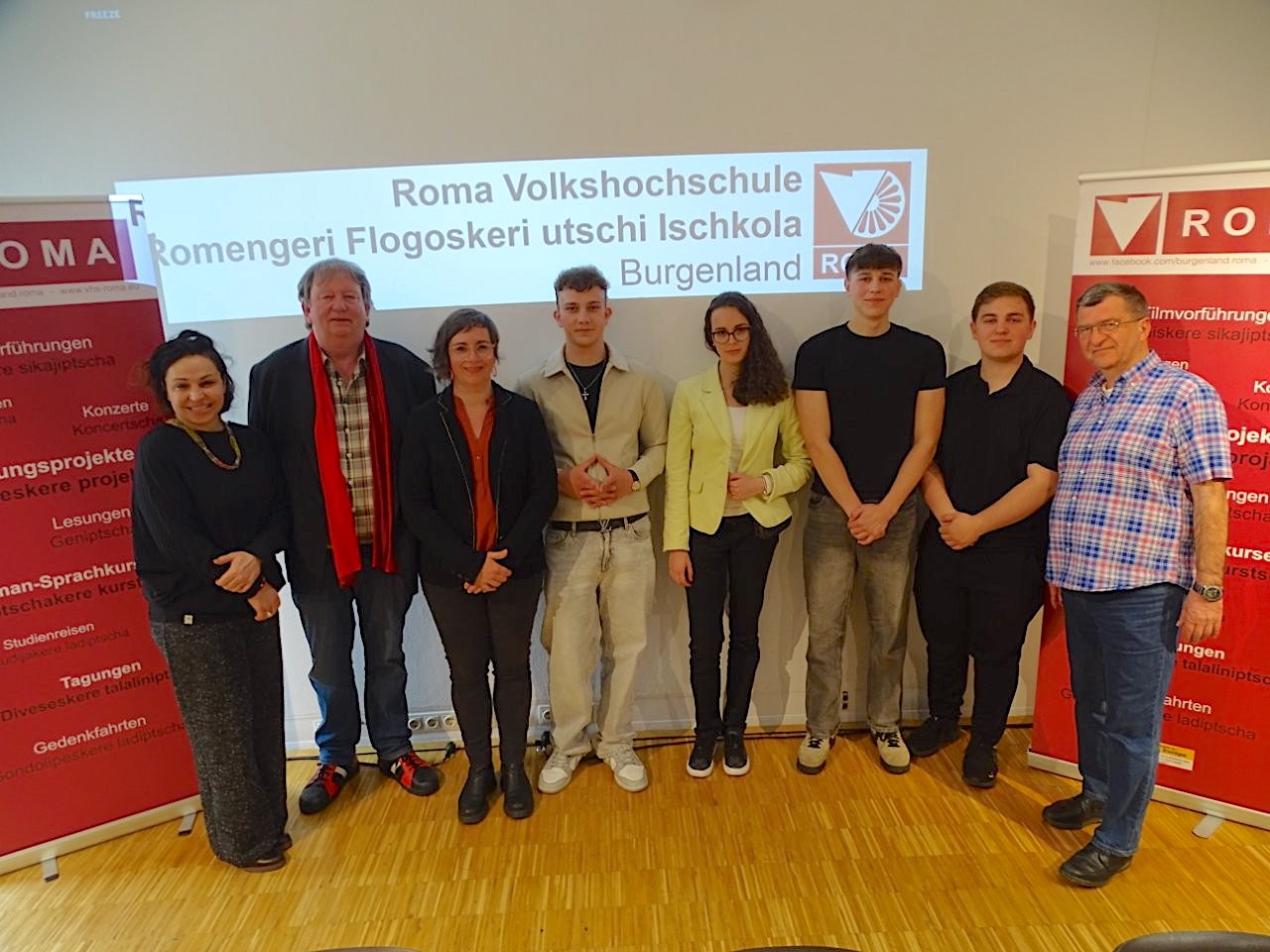 Im Bild: VHS-Roma-Team – Melinda Tamás, Horst Horvath, Verena Liszt-Rohlf mit den Podiumsteilnehmer*innen der Volksgruppen Adolf Gussak (Roma), Szophia Elö und Mika Jandrisits (Kroaten), István Mihály Zsötér (Ungarn) Foto: (c) VHS