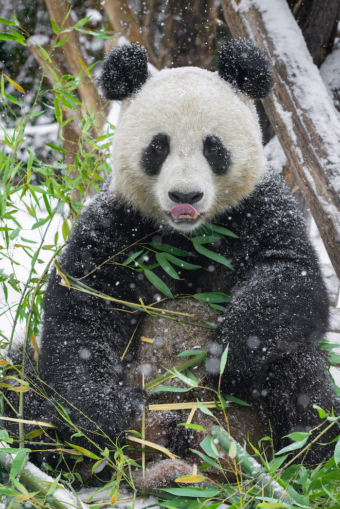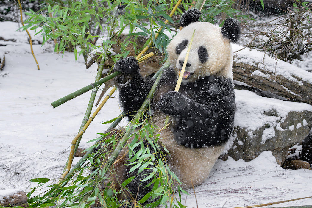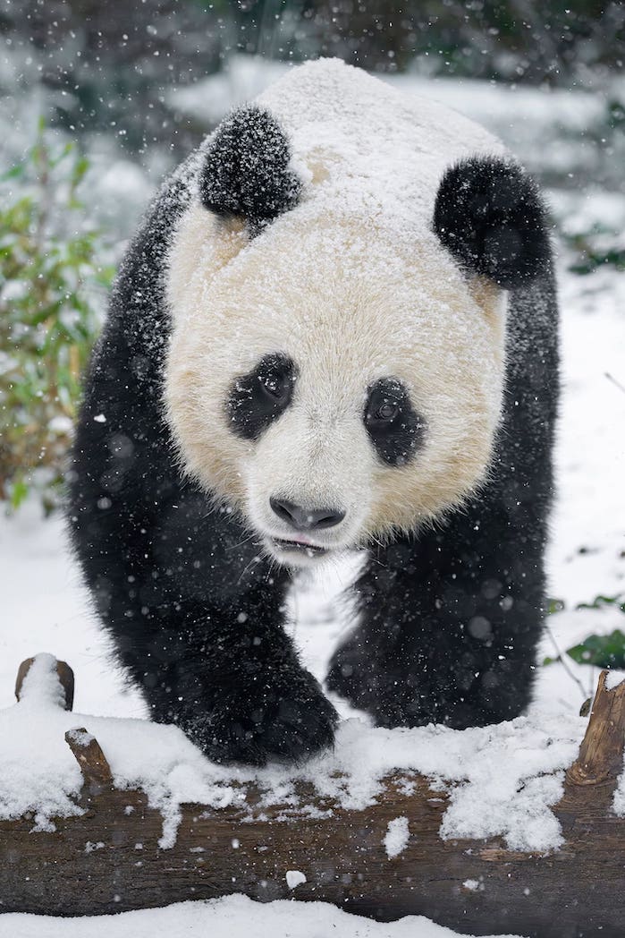 Vom gemächlichen Panda-Dasein mit Fressen und Schlafen ist an einem verschneiten Wintertag keine Spur. Vielmehr wird auf den winterlichen Baumstämmen geklettert und sich im Schnee gewälzt. Auf den ersten Blick sind dann nur noch die schwarzen Flecken um die Augen der Tiere im Schnee auszumachen.