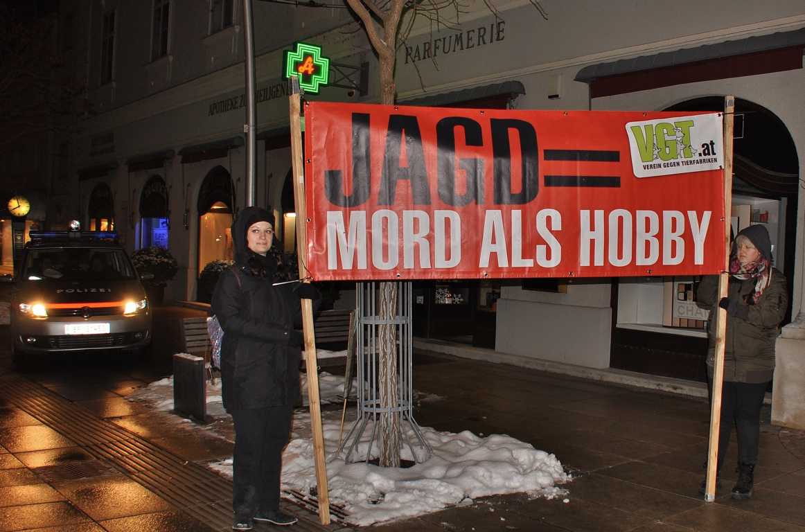 Auch 2018 trafen sich vor dem Sparkassensaal in Wr. Neustadt wieder eine Handvoll Aktivisten von VGT, dem Verein Gegen Tierfabriken um mit sehr lauter Musik und zwei Transparenten gegen die Jagd zu demonstrieren, was die trachtig bekleideten Ballgäste allerdings keineswegs davon abhielt, den gut organisierten Ball der Hubertusrunde Wiener Neustadt zu besuchen. Der Jägerball der Hubertusrunde zählt zu einem der beliebtesten und bestbesuchtesten Bälle in Wr. Neustadt.