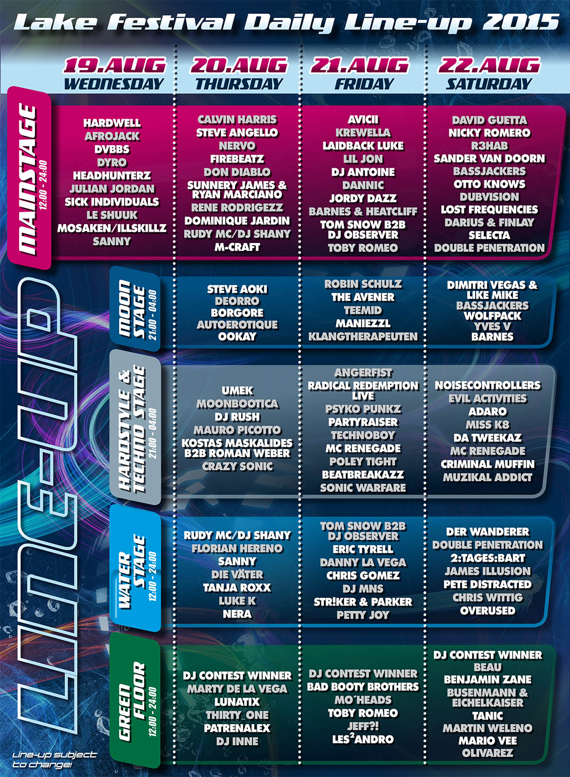 Die Festivalbesucher erwartet von 19. .bis 22. August ein Musik-Programm mit sensationellen 100 Live-Acts,. Und das auf der größten Bühne Europas, die 100 Meter breit und 26 Meter hoch ist. Mega-Stars wie Dj AVICII, David Guetta, Calvin Harris, Big 4, DJ Hardwell, Dimitri Vegas & Like Mike, Angerfist, Steve Aoki, DJ R3HAB und Steve Angello bringen den Schwarzlsee zum Beben! Fünf Jahre wurde das Lake-Festival, das EDM (Electronic Dance Music)-Festival immer jeweils an einem Tag abgehalten. 2015 wird das EDM-Festival erstmals an vier Tagen auf fünf Bühnen und mit 100 Acts stattfinden.