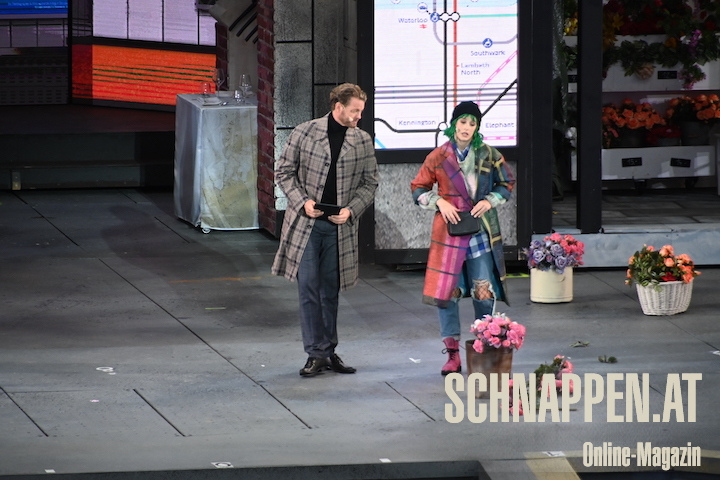 Im Bild: Professor Higgins und Punk-Eliza in der U-Bahnstation.