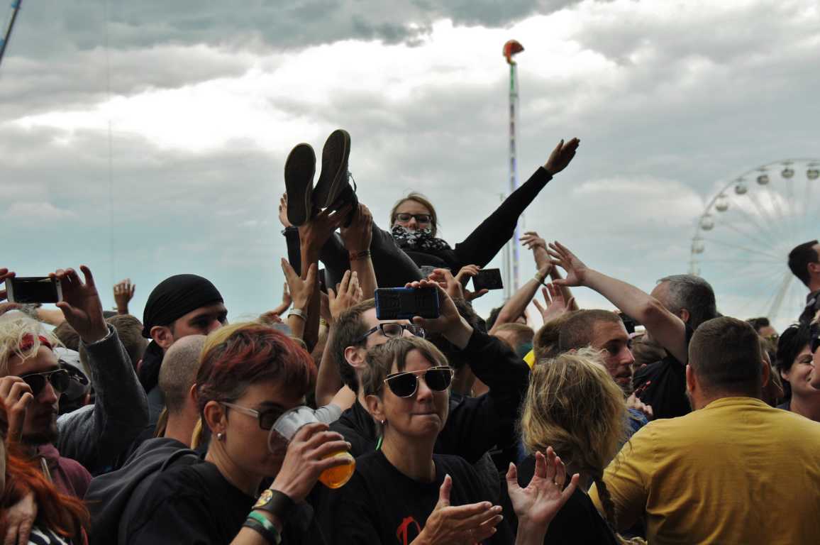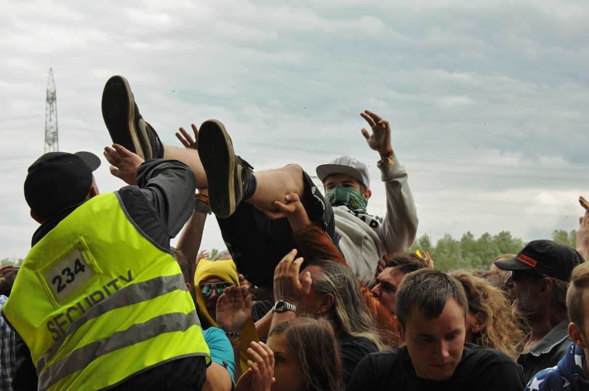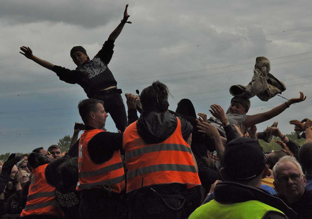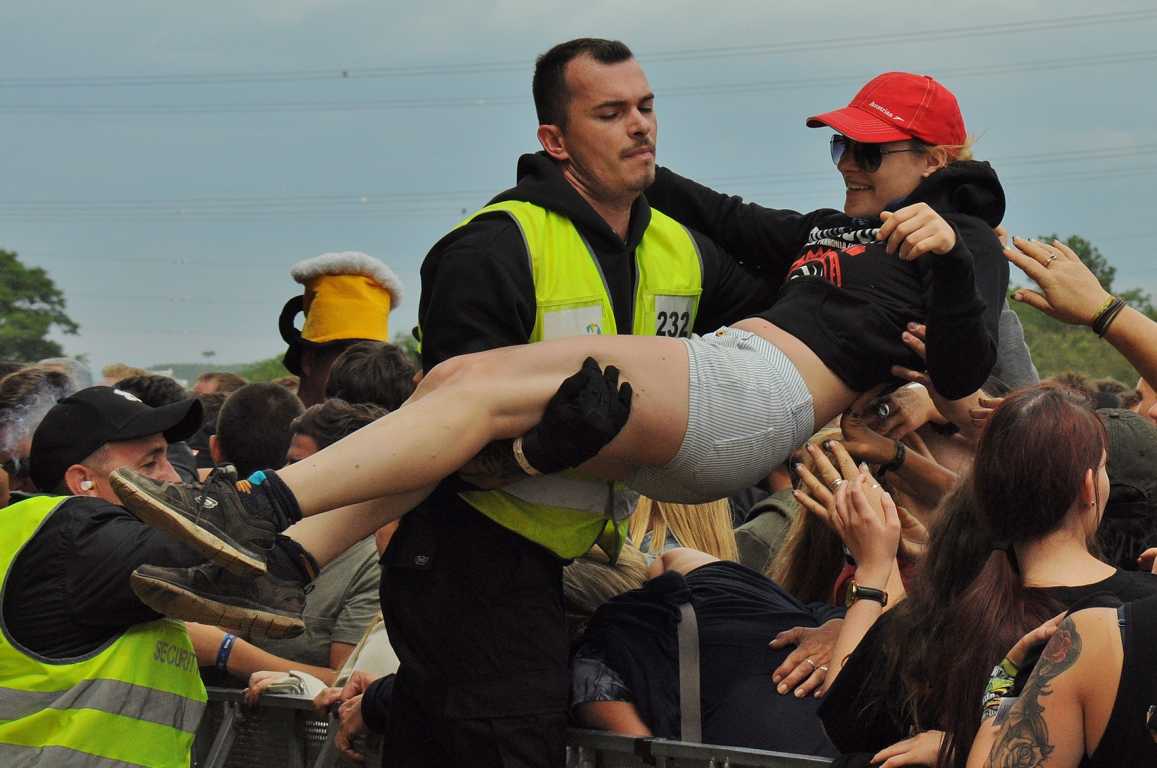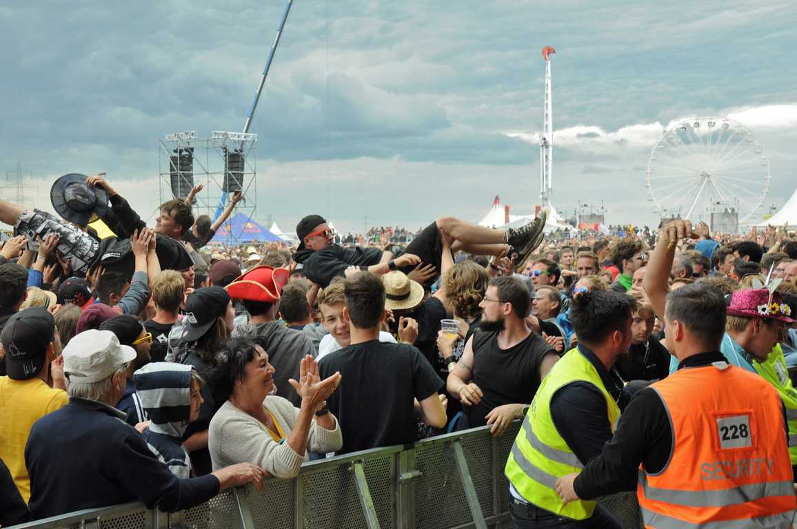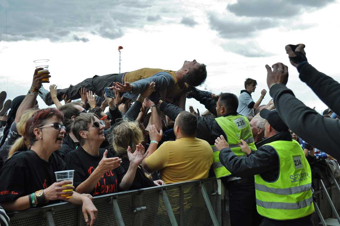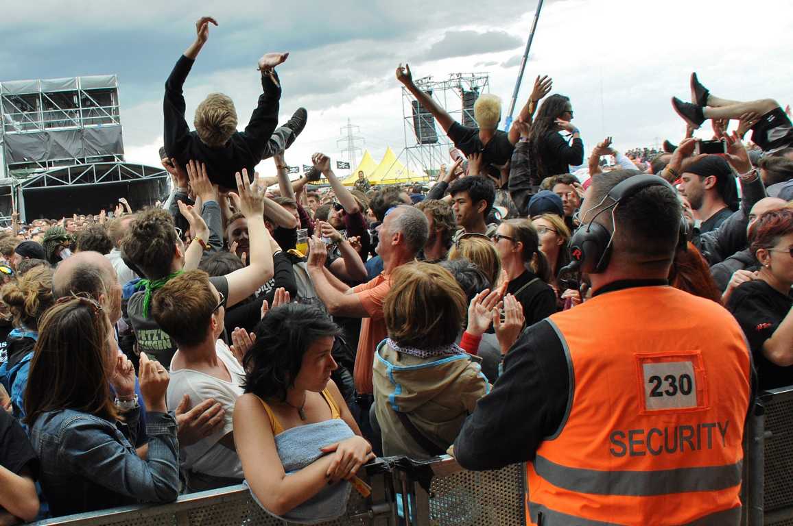 Obwohl Crowd Surfing auf einigen Festivals verboten ist, weil es immer wieder zu Verletzungen im Publikum kommt, zum Nova Rock auf den Pannonia Fields in Nickelsdorf in Österreich gehört es dazu. Die Securitys vor der Bühne haben die Publikums-Action voll im Griff, sie beweisen unter höchster Anspannung Professionalität und fangen die Crowdsurfer gekonnt auf