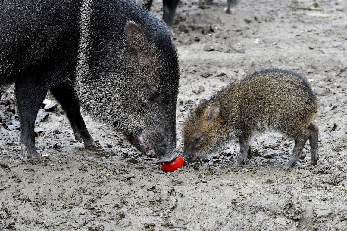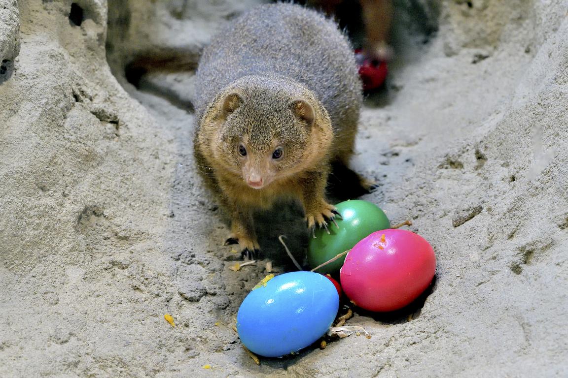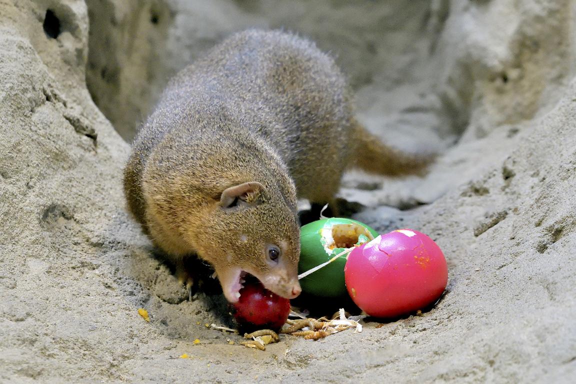 "Halsbandpekaris sind in den Savannen und Wäldern Mittel- und Südamerikas zuhause und gehören zur Familie der Nabelschweine. Sie haben einen bunten Speiseplan mit viel Gemüse, aber auch mit Fleisch und Eiern. Die von den Tierpflegern versteckten bunten Eier, haben die Halsbandpekaris im Nu gefunden und gefressen", schildert Kuratorin Simone Hadertauer. Zurückhaltender bei der Ostereiersuche waren die Zwergmangusten, sie bevorzugten eher die Mehlwürmer, die im Osternest versteckt waren.