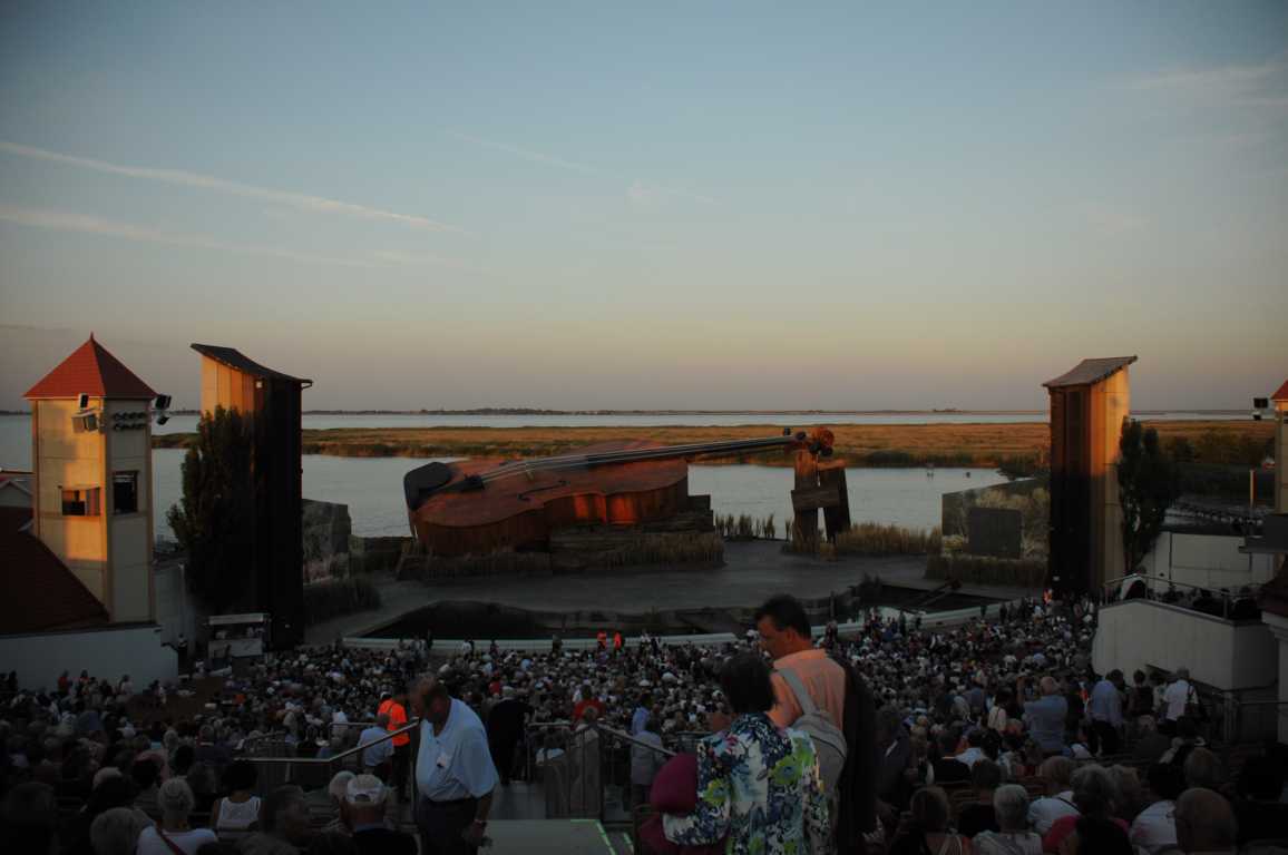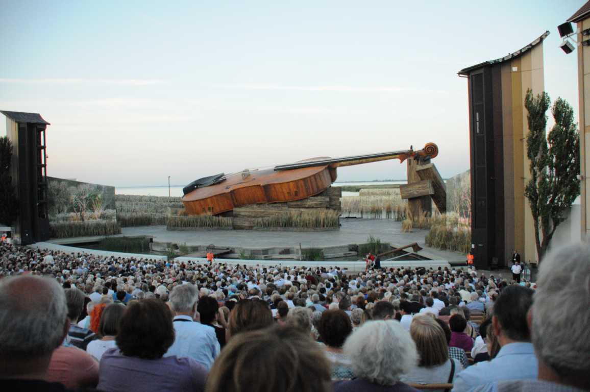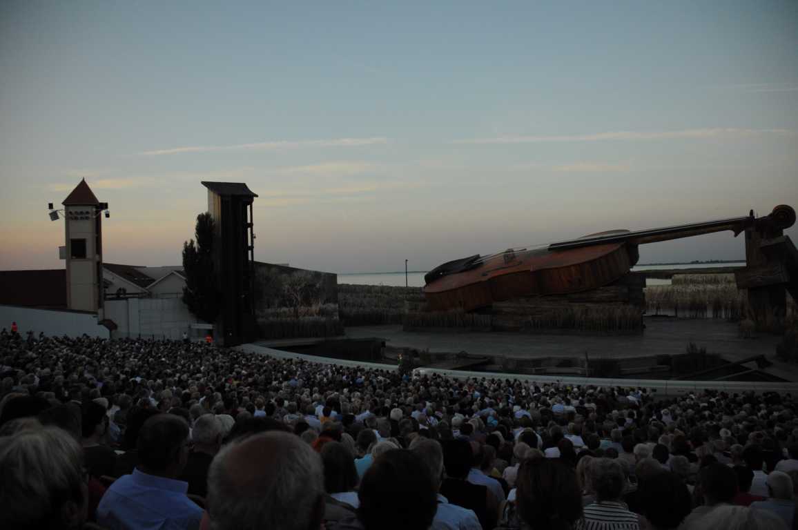 Mit der größten Geige der Welt, die mit einer Länge von 45 Metern und einer Höhe von 14 Meter wie auf einem Floß Schilf des Neusiedlersees im Burgenland zu treiben scheint, haben die Seefestpiele Mörbisch ein äußerst beeindruckendes Bühnenbild ins Wasser gestellt. Die Seefestspiele Mörbisch sind nicht nur zur Premiere sehr gut besucht, sondern auch während der anderen Vorstellungstage, so auch donnerstags im Juli 2018. Die Vorstellungen der "Gräfin Mariza"-Produktion im Burgenland (Österreich) laufen noch bis 25. August von Donnerstag bis Samstag um jeweils 20 Uhr.Mehr über