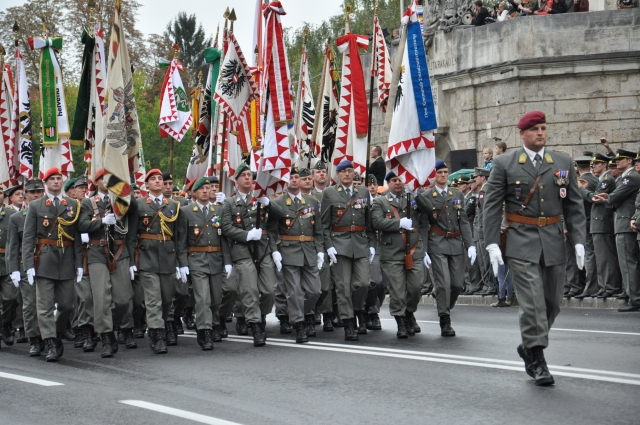 Militäreinheiten des österreichischen Bundesheeres. Der Großteil der Bilder wurde bei der Parade auf der Grazer Straße in Wr. Neustadt, Österreich aufgenommen.