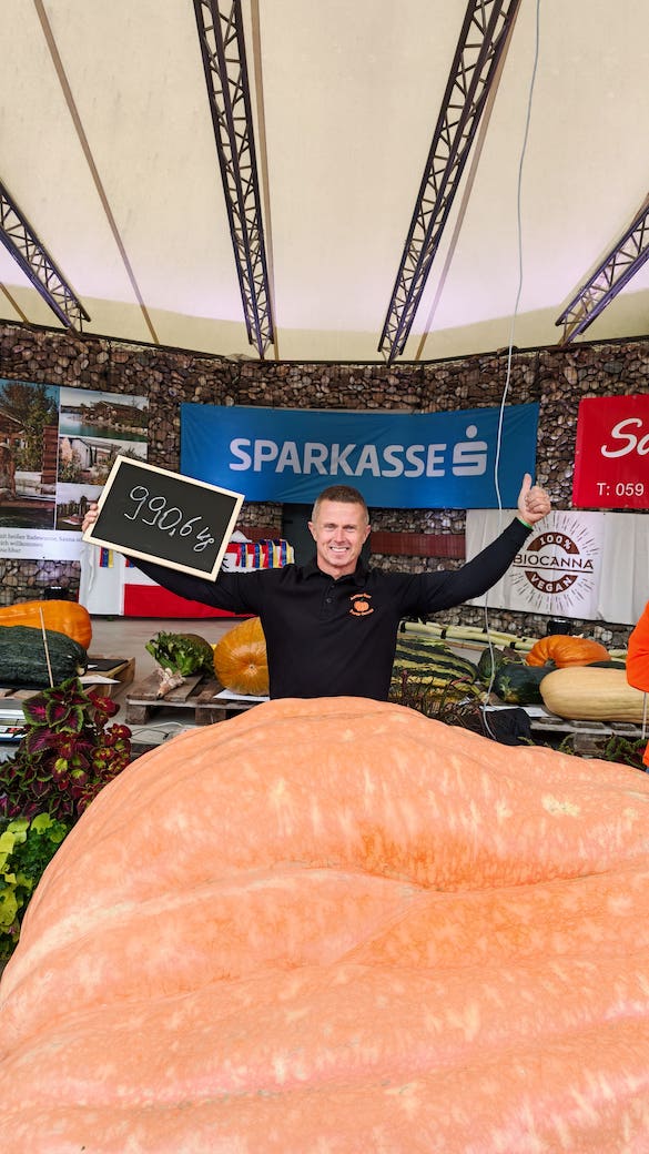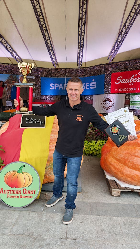 Wolfgang Nittnaus aus dem Burgenland krönte sich am 4. Oktober 2025 mit dem gewaltigen 990,6 Kilogramm schweren"Atlantic Giant"-Kürbis zum neuen Staatsmeister und hat somit den bisherigen Österreichrekord mit weit über 100 kg übertroffen.