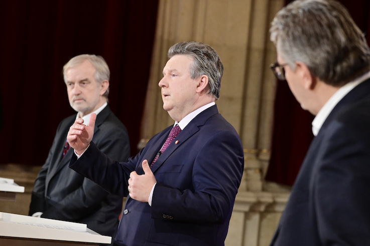 Am 12. Jänner 2021 stellten sich im Wiener Rathaus Bürgermeister Michael Ludwig, Gesundheitsstadtrat Peter Hacker und der Ärztekammer-Vizepräsident Johannes Steinhart einem Mediengespräch.