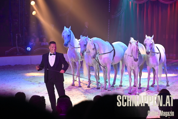 Louis Knie Junior ist Tierlehrer und zeigt im Zirkus in Wien eine Freiheitsdressur mit den weißen Friesen.