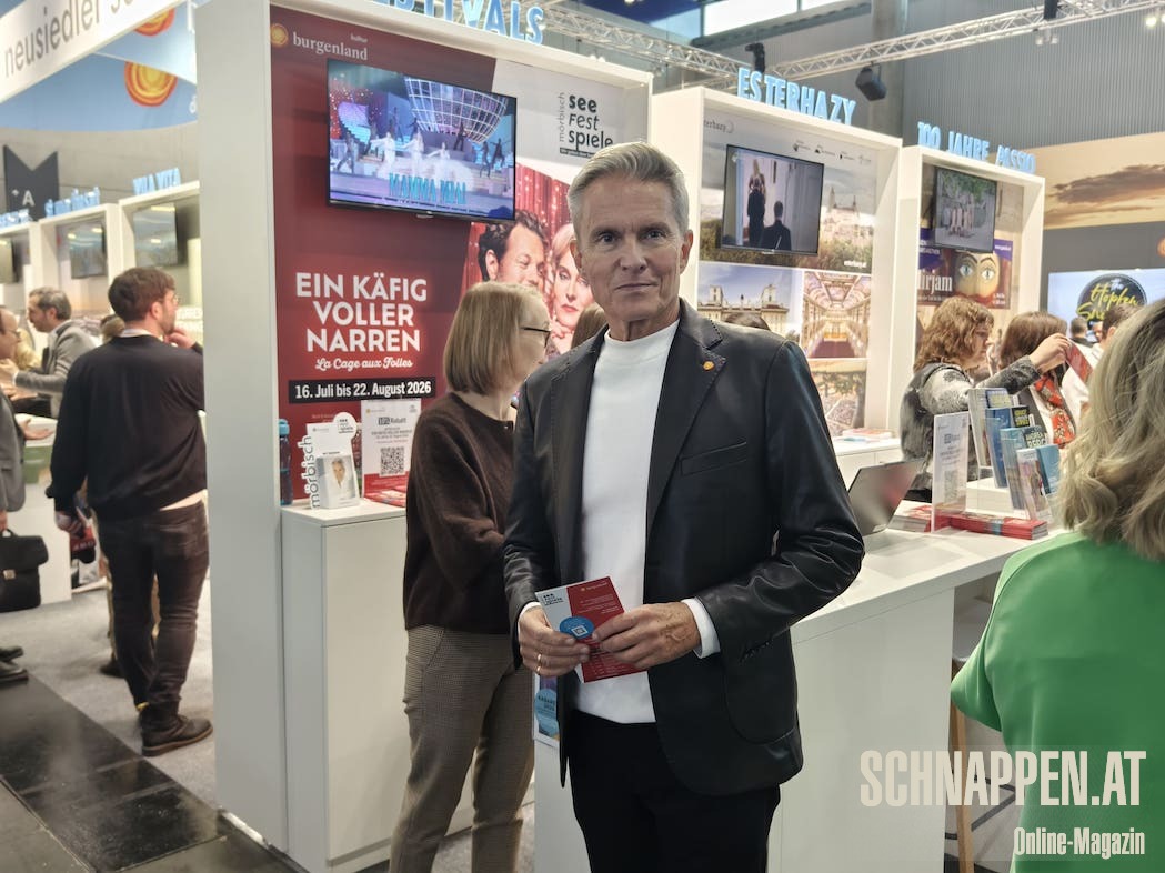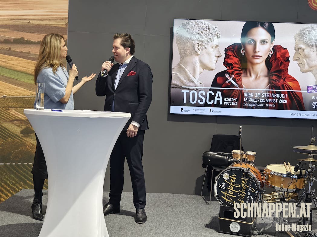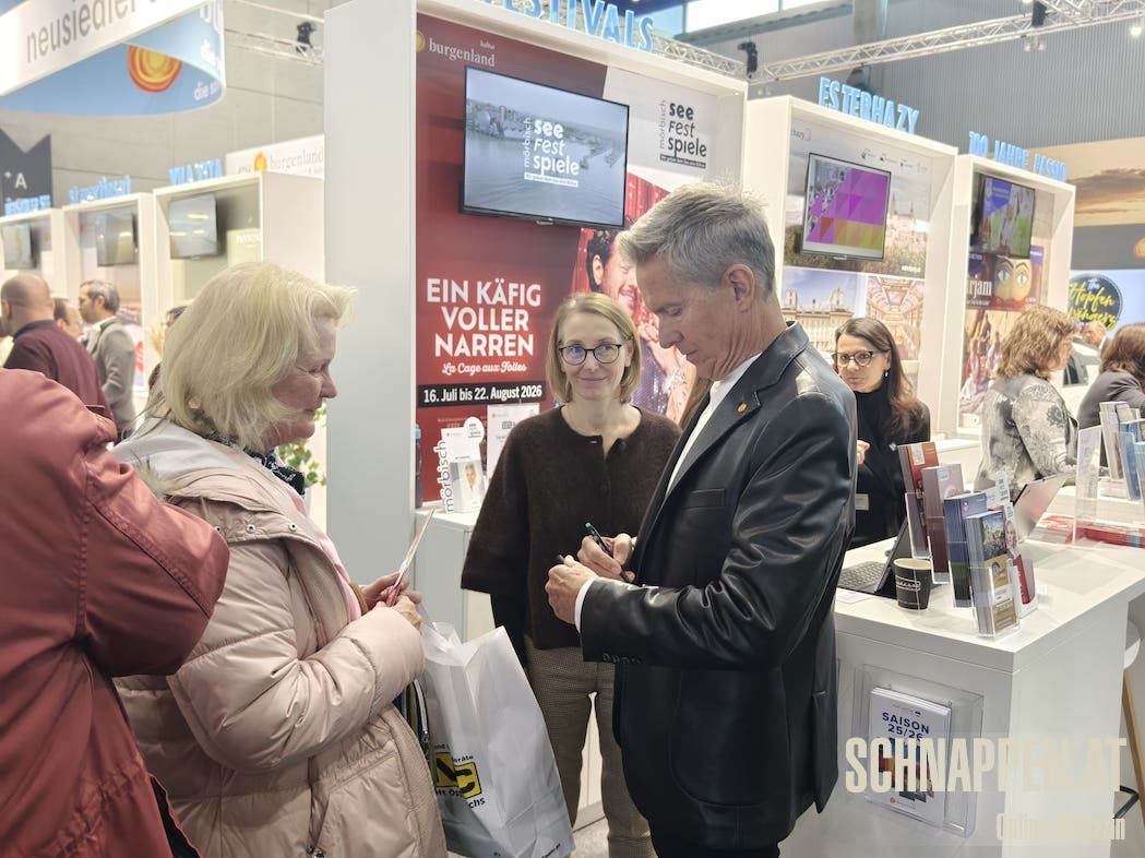 Auch prominente Gäste wie Daniel Serafin, Intendant der Oper im Steinbruch, und Dietmar Posteiner, Festspieldirektor der Seefestspiele Mörbisch, waren am ersten Messetag am Burgenland-Stand, um für ihre kulturellen Veranstaltungen in der Region zu werben.