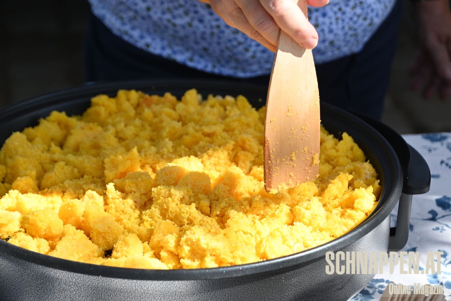 - Nun das Schweineschmalz in einem eigenen Topf erhitzen. Wenn es richtig heiß ist in den Sterz gießen. Den Sterz rösten lassen und mit dem Kochlöffel während des Röstens in kleine mundgerechte Stücke zerreißen.
