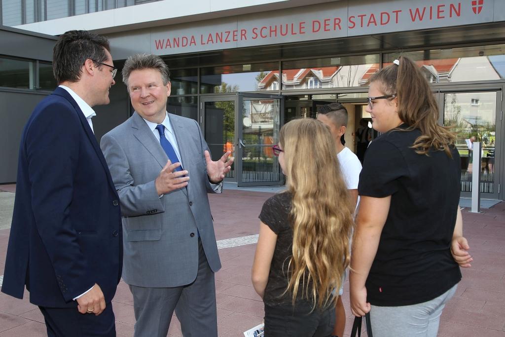In nicht einmal zwei Jahren Bauzeit entstand am Regnerweg in Stammersdorf/Floridsdorf auf einem 11.000 Quadratmeter großen Grundstück die neue ganztägig geführte Mittelslschule, in die die Stadt Wien allein im Jahr 2018 rund 120 Millionen Bauarbeiten-Euro investierte. "Damit konnten wir wichtigen neuen Schulraum in einem dynamisch wachsenden Stadtgebiet schaffen", präsentierte Bürgermeister Michael Ludwig gemeinsam mit Bildungsstadtrat Jürgen Czernohorszky, Bildungsdirektor Heinrich Himmer und Bezirksvorsteher Georg Papai Ende August 2018 den neuen Schulstandort.