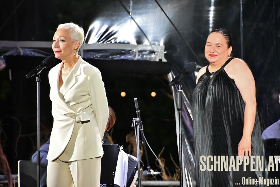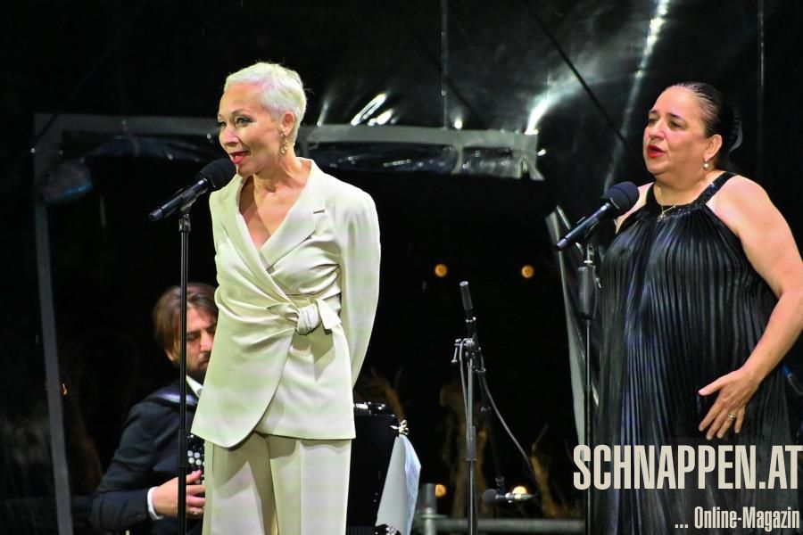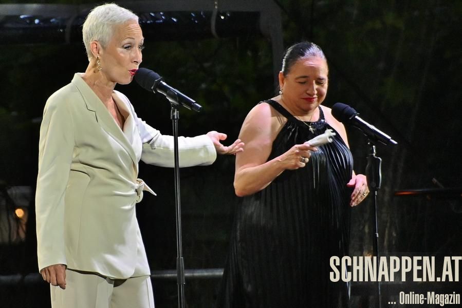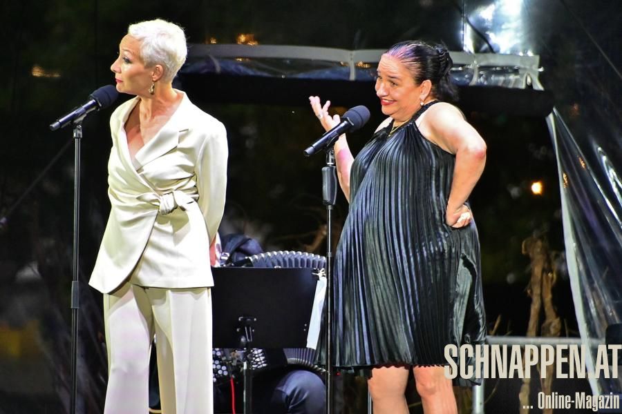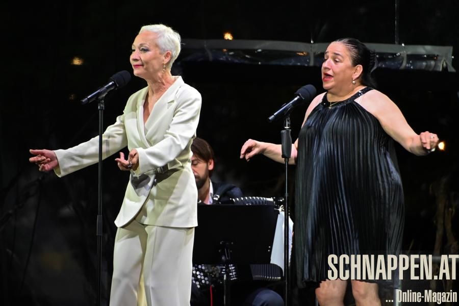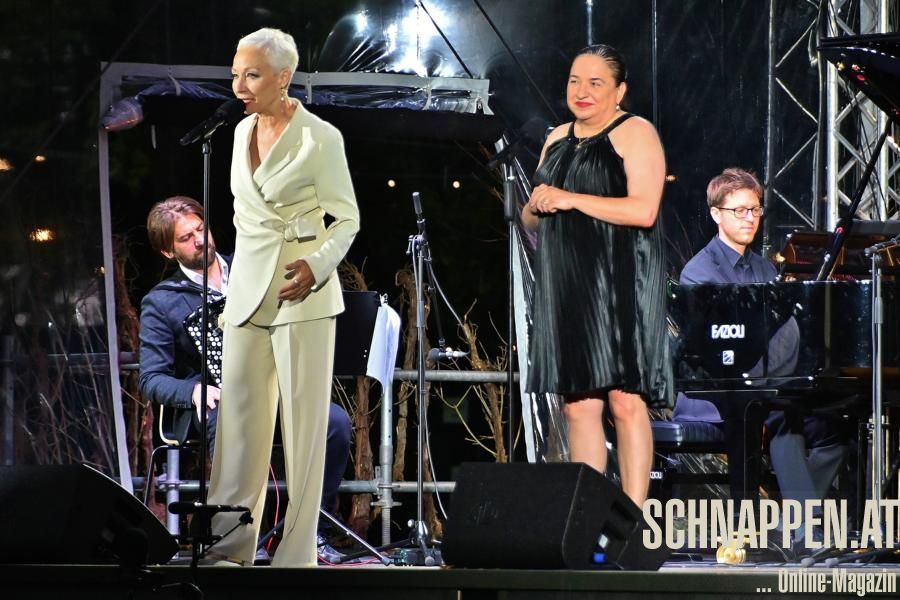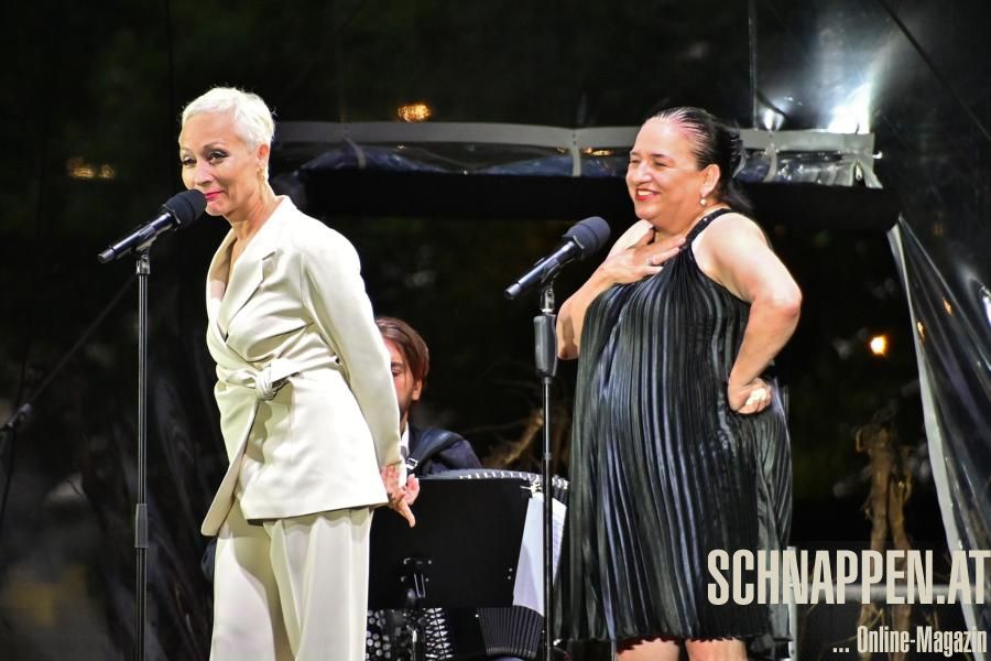 Am 14. Juli 2020 stehen die 1962 geborene deutsche Schauspielerin und Regisseurin Maria Happel und die 1961 geborene Wienerin, Schauspielerin, Sängerin und Tänzerin Sona MacDonald gemeinsam auf der Sommerbühne "Theater im Park" im Schwarzenberggarten im Oberen Belvedere in Wien (Österreich). In den Rollen der Marlene Dietrich und Edith Piaf begeistern die beiden Künstlerinnen mit "Spatz und Engel" ihr Publikum.