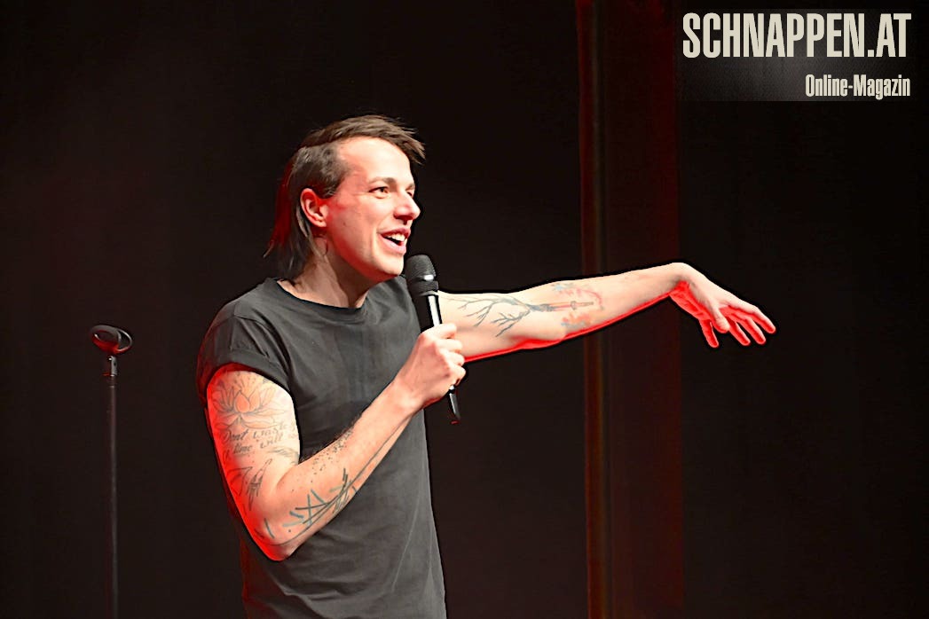 Marco Pogo erzählte im Kabarett "Lost & Found" über einige seiner sehr kuriosen Erlebnisse, über verschusselte Reiseplanungen und teure Flugreisen, über die Kindheit, über Absurditäten in seinem Leben, übers Poltern in Schottland über die Komik des Alltags, über den Bürgermeister einer Millionenstadt in Österreich und über Armin Wolf und die ZiB2.