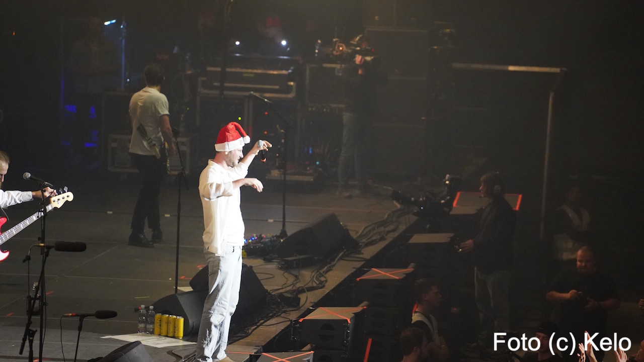 Der Sänger Michael Marco Fitzthum mit dem Künstlernamen Marco Wanda setzte sich seine Weihnachtsmütze auf und legte mit den großen Wanda-Hits los. Immer wieder warf er verschiedene Teile wie T-Shirts und Getränke in die Zuschauermenge.