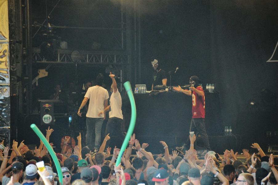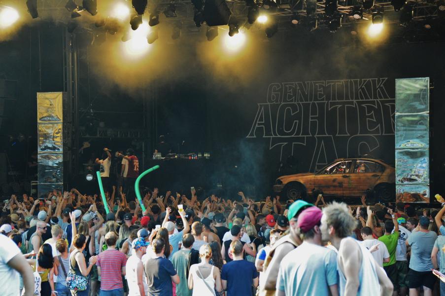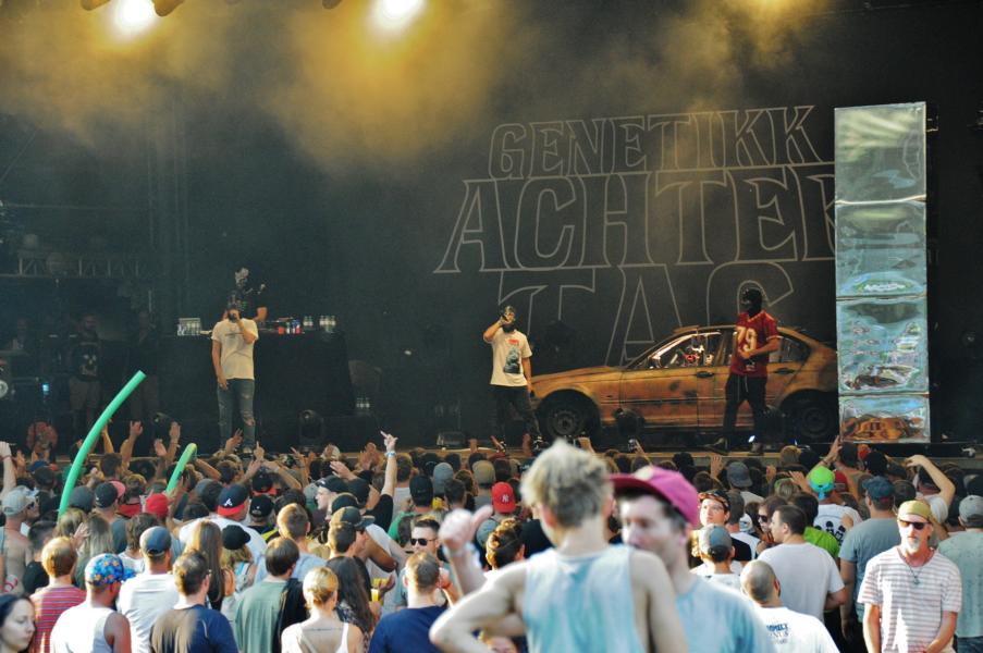 Genetikk, die maskierten Rapper aus Saarbrücken in Deutschland gastierten beim "Hip Hop Open Austria" 2016 in Wiesen im Burgenland (Österreich). Als Kulissen-Teil zerrte das Genetikk-Team einen ramponierten PKW auf die Festivalbühne in Wiesen.
