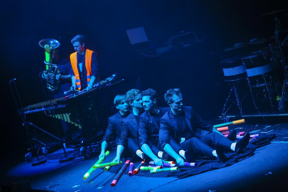 Gespickt war das Konzert mit einer Lichtshow und dem musikalischen Schauspiel, bei dem die Musiker auf ihre eigene, besondere, sehr heitere Art kurze Geschichten erzählten. So kämpften sie in Ritterrüstung mit leuchtenden Schlagzeugsticks "um die Prinzessin", imitierten mit den Boomwhacker-Röhren Ruder und damit eine Fahrt im Ruderboot und erzeugten mit dem Rainmaker das Geräusch von sphärischen Wasserfällen.