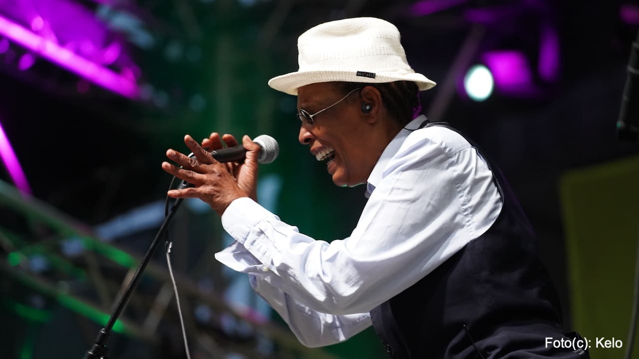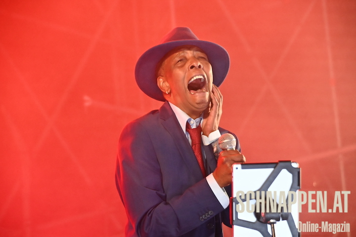 Marla Glen liefte im blauen Herrenanzug mit Hemd, Hut und getupfter Krawatte Mitte August 2022 beim Picture On Festival im Südburgenland (Österreich) mit ihrer Band einen starken Auftritt. Mehr über