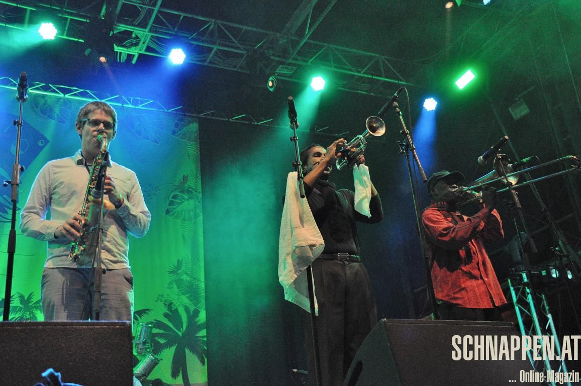 The Skatalites & Stranger Cole präsentierten dem österreichischen Reggae-Publikum als Abschlussband auf der großen Bühne des One Love Festivals am 3. August 2019 in Wiesen ein gelungenes Finale. Skatalites verwöhnten die Wiesen-Besucher mit schwungvollem Ska-Sound aus Jamaika. Eine nette Geste war, dass die Veranstalter nach Mitternacht mit einer Torte auf die Bühne kamen, um dem Posaunisten Vin Gordon zu seinem 70. Geburtstag zu gratulieren. Mehr über