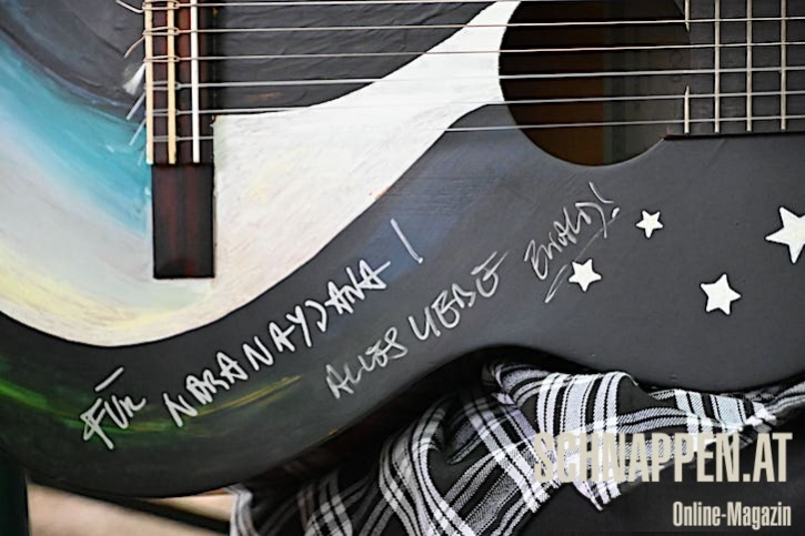 Naranayjana zeigt ganz stolz die Widmung, die ihr Ewald Pfleger von Opus auf ihrer Gitarre hinterlassen hat und freut sich auf den Auftritt in Wiesen.