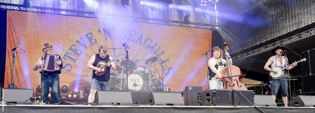 Steve 'n' Seagulls, die finnische Country-Band, die seit 2014 die großen Hits der großen Rockbands nicht nur covert, sondern auf ihre eigene Art zu Bluegrass-Songs macht, trat am 12. Juli 2025 beim AREA 53-Festival in Leoben in der Steiermark auf.