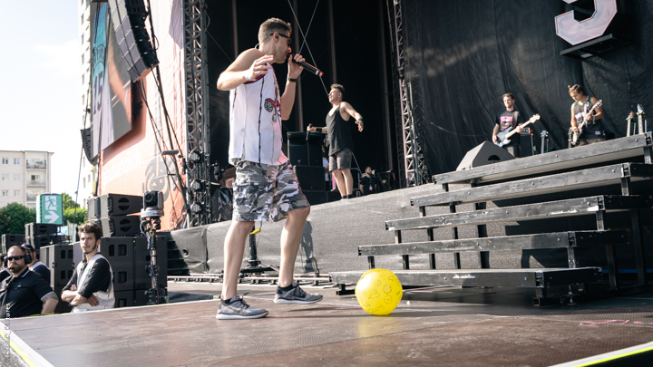 SDP, die Hip-Hop-Gruppe aus Berlin in Deutschland stand mit den Sängern Vincent Stein und Dag-Alexis Kopplin, mit dem Bassisten Raphael Seidel, dem Schlagzeuger Thilo Brandt, dem DJ Qris und dem Gitarristen Benedikt Sturm im Juni 2023 beim Lido Sounds Festival in Linz in Österreich auf der Bühne.