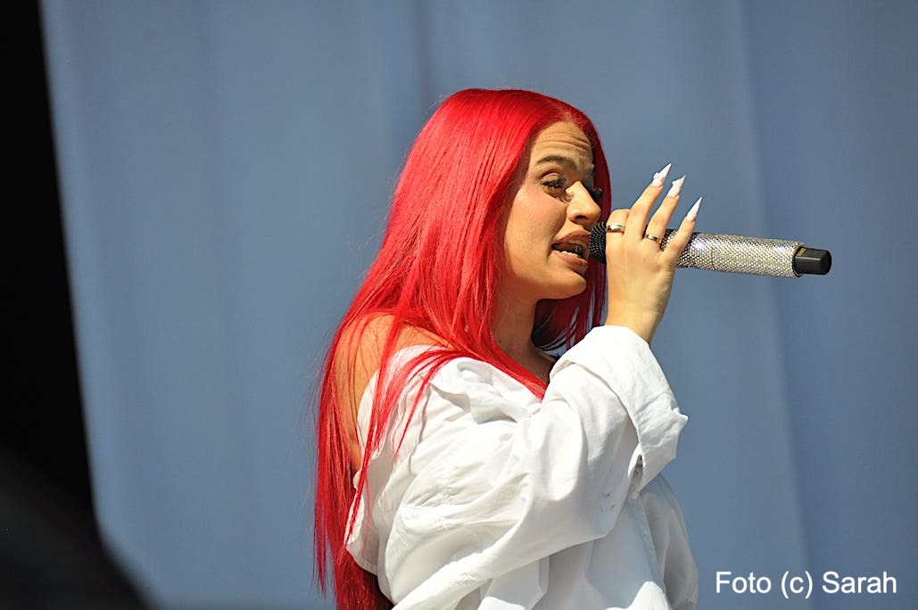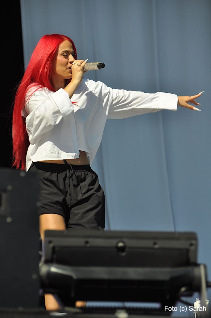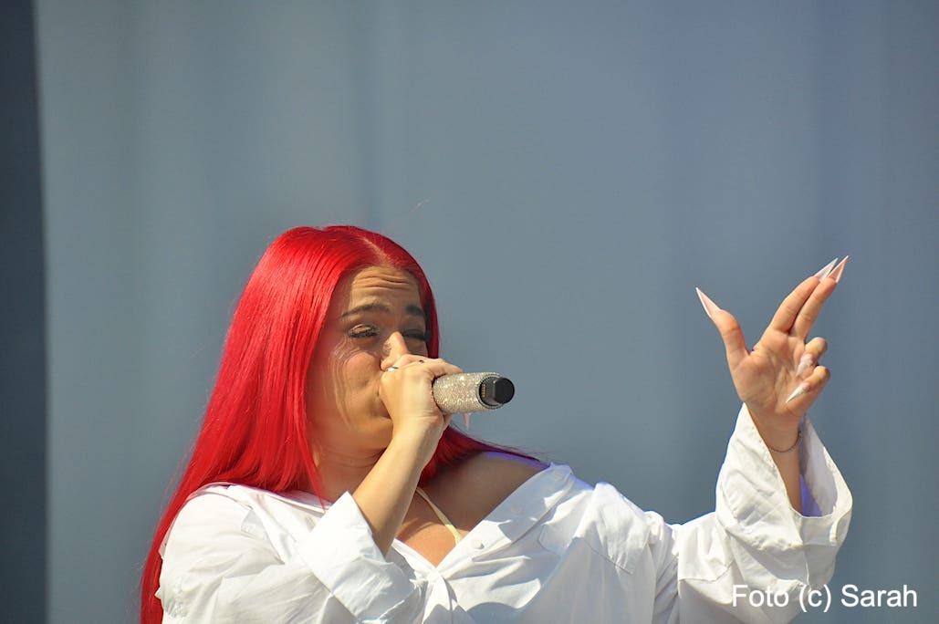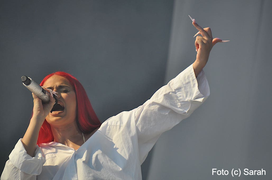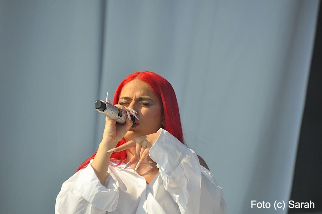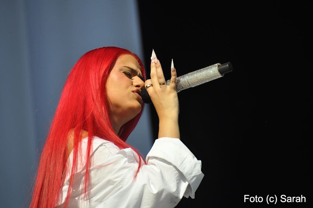 Im Bild: Badmómzjay, die deutsche Rapperin mit knallrotem Haar und extrem langen Stiletto Mails. Foto (c) Sarah