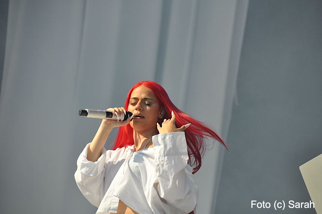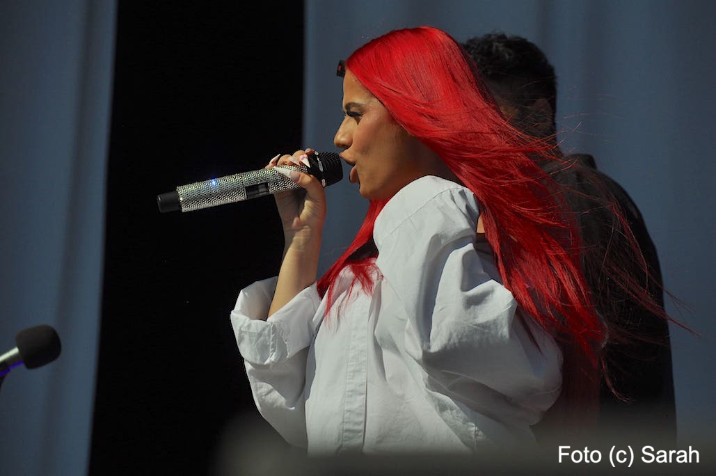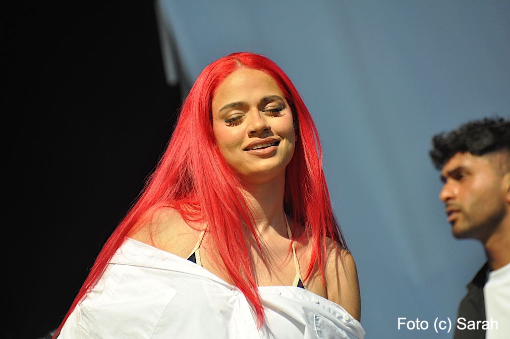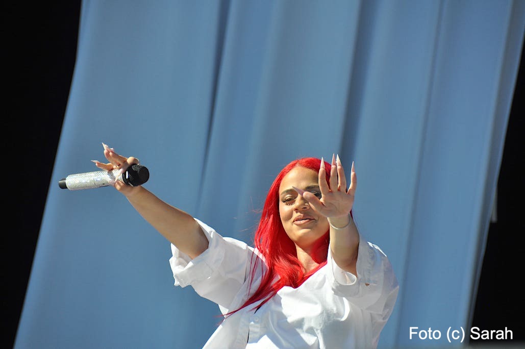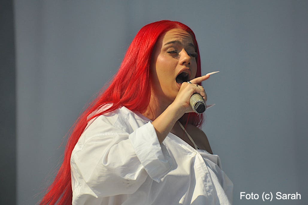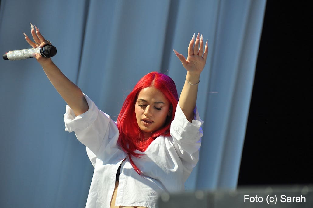 Im Bild: Badmómzjay, die deutsche Rapperin mit knallrotem Haar und extrem langen Stiletto Mails. Foto (c) Sarah