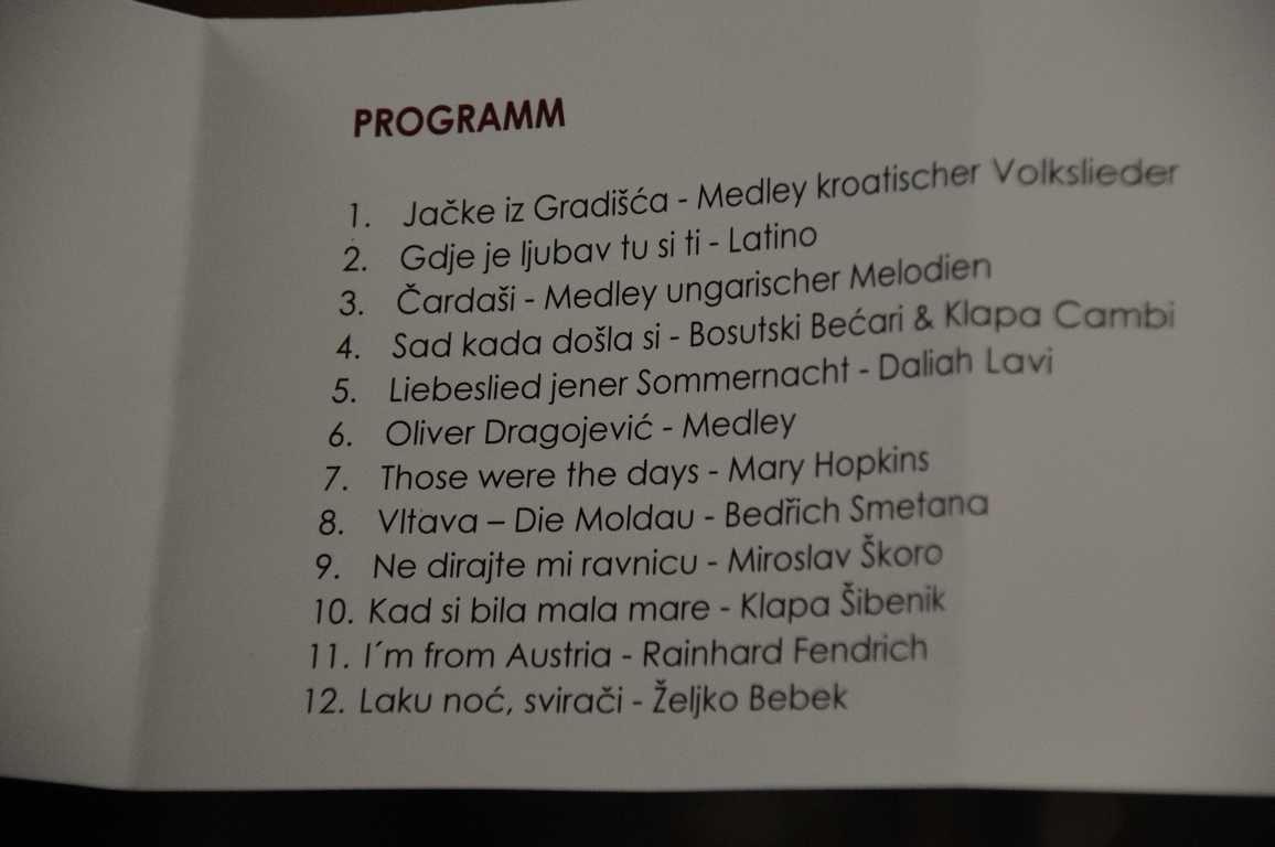 Unter der Leitung von Prof. Matija Moslavac spielte das Tamburizza-Orchester kroatische Volkslieder, ungarische Melodien, Popsongs, Schlager und klassische Werke. Das Publikum dankte den Musikern für den Auftritt mit heftigem Applaus. Durch das Programm führte Daniel Muhr.