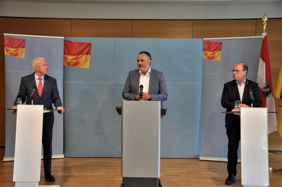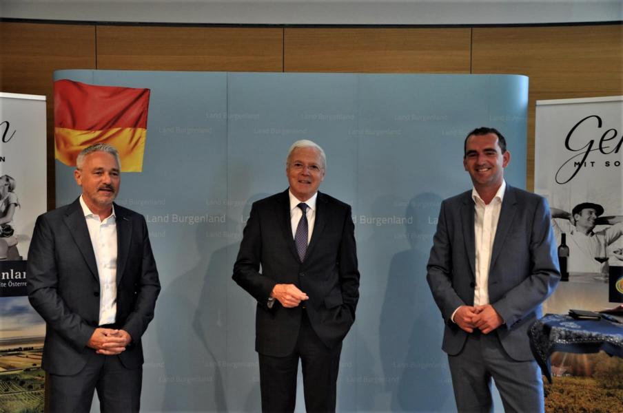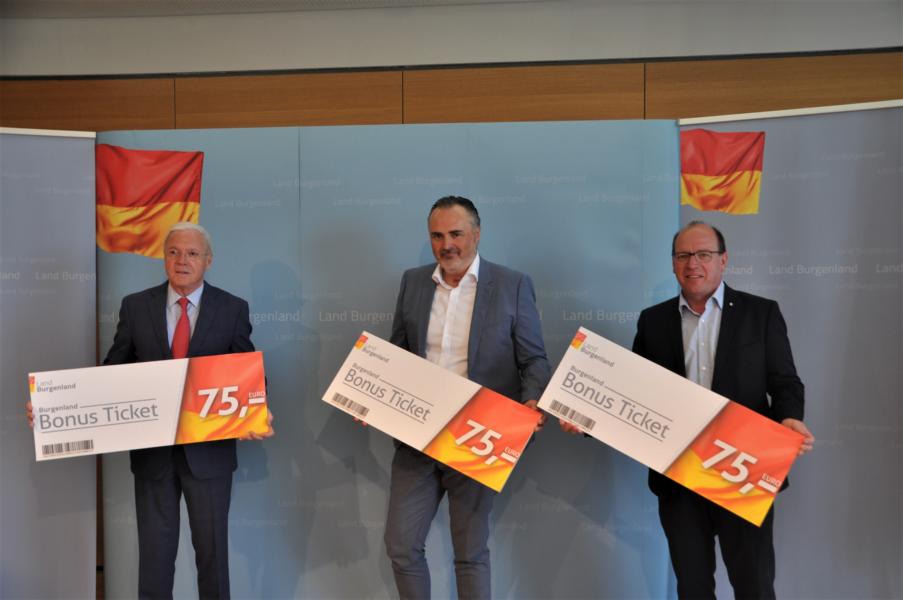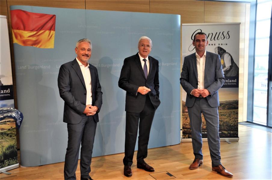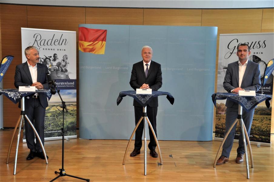Landeshauptmann Hans Peter Doskozil, Burgenland-Tourismus-Aufsichtsrat Gerhard Gucher und Wein Burgenland-Präsident Andreas Liegenfeld stellten am 27. Mai 2020 im Kultur- und Kongresszentrum in Eisenstadt das Bonusticket-Programm vor, mit dem der burgenländische Tourismus wirkungsvoll unterstützt werden soll.