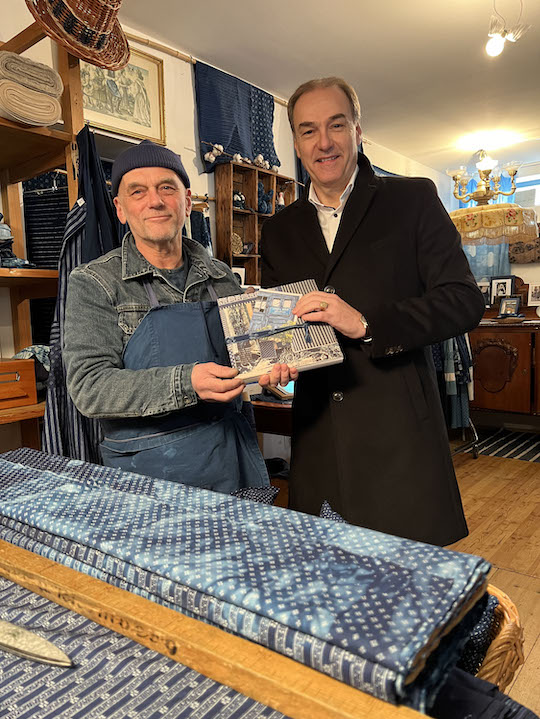In aufwendiger Handarbeit bedrucken die beiden Stoffe nach einer alten Tradition und färben diese mit natürlichem Indigo.