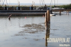 "Nach ersten Schlammentfernungsarbeiten können wieder verschiedene Wassersportarten ausgeübt werden", so Landesrat Heinrich Dorner bei einem Lokalaugenschein am 11.8.2022 mit Landeshauptmann Stellvertreterin Astrid Eisenkopf und Bürgermeister Gerold Stagl in Rust.