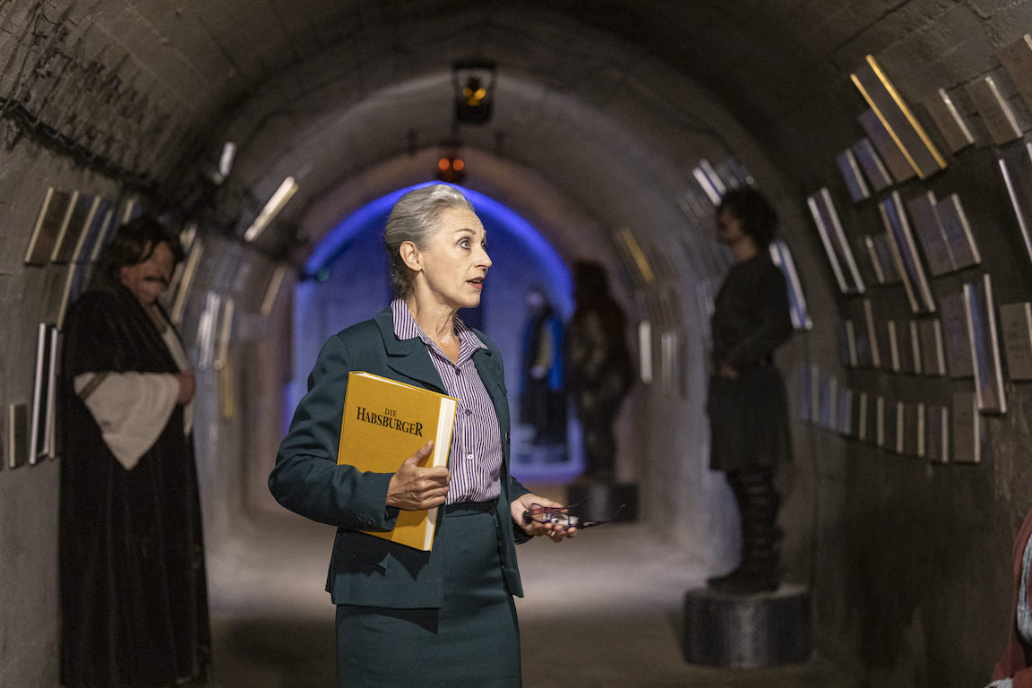 Das auf 900 Meter aufgebaute Stationentheater im Bunker lässt für 90 Minuten Dokumentenfälscher, lesbischen Erzherzoginnen, transvestitische Kaiserbrüder und Chlor-reiche Heilige bis zu nasenlose Exhibitionisten, hochherrschaftliche Sexualtherapeuten, geistig beschränkte Knödelliebhaber und alternative Totalaussteigern aufleben.