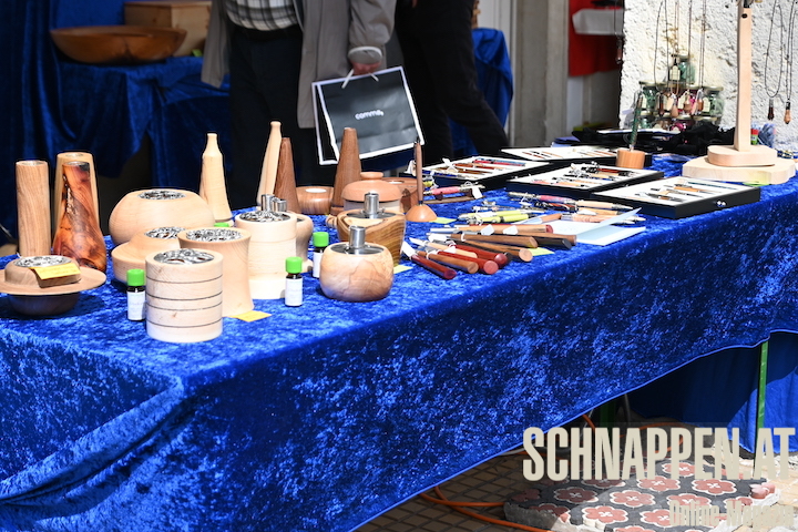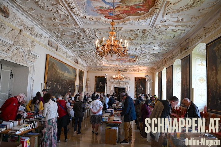 Im Stift Heiligenkreuz wurde so manch BesucherIn auch 2023 beim Bücherflohmarkt im Kaisersaal im ersten Stock bei Pater Florian fündig, während Pater Meinrad im Stiftsinnenhof das Schaudrechseln vorführte.