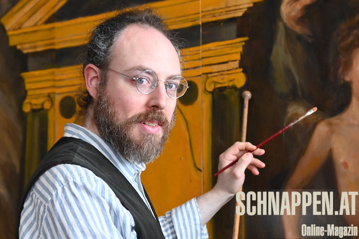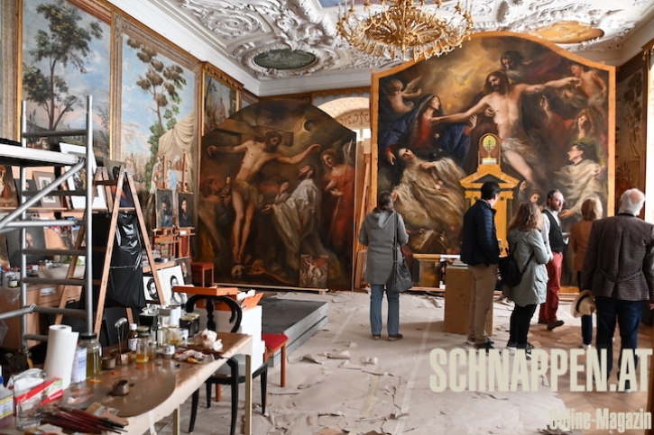 Besonders spannend war der Blick in die Malerwerkstatt, wo Clemens Maria Fuchs noch bis September 2023 an den großen Kunstwerken für die Kreuzkirche arbeitet und den BesucherInnen die vielen Fragen über seine Malerei, die Technik und die Motive beantwortete.