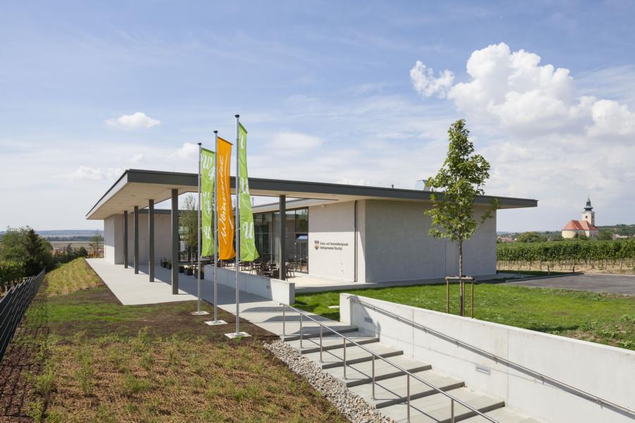 Nach einem Architektur-Wettbewerb und gemeinschaftlichen Entwicklungsprozess entstand ein Kultur- und Veranstaltungszentrum mit Gebietsvinothek und Restaurantbetrieb als klassischer Pavillontypus, der die Weinviertler Landschaft von allen Richtungen ins Innere holt.