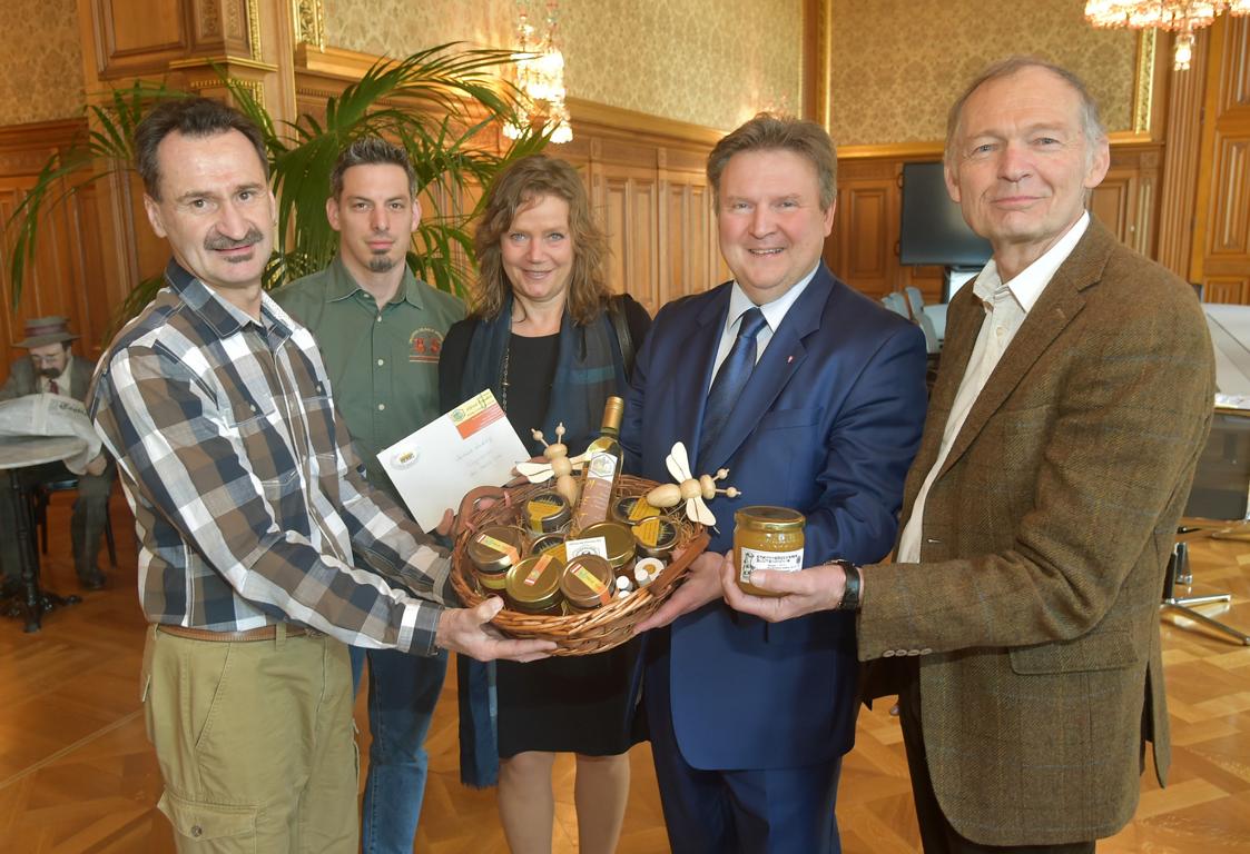 Rathaus-Imker Alfred Hauska, selbst Vorstand der Donaustädter Imker brachte mit Daniela Schmidt, Michael Drachsler und Erich Witzmann vom Wiener Landesverband für Bienenzucht eine Kostprobe des Rathaus-Honigs zu Stadt-Chef Michael Ludwig.