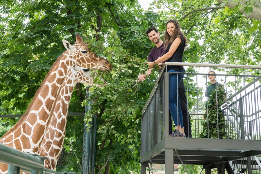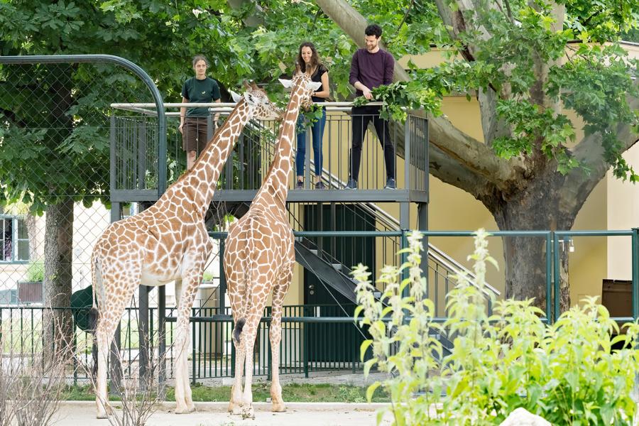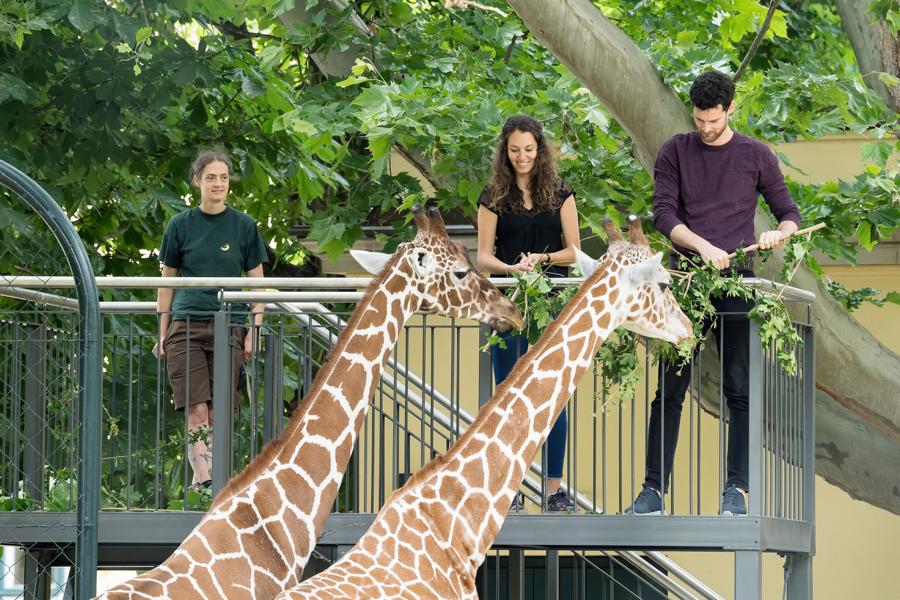 Im Tiergarten Schönbrunn in Wien ist es möglich, den Giraffen auf gleicher Höhe in die Augen zu blicken und sie zu füttern. Zoodirektor Stephan Hering-Hagenbeck über die Sonderführung "Giraffen-VerFührung": "Für unser neues Angebot haben wir einen besonderen Hochstand gebaut. So ist man mit unserem Netzgiraffen-Trio Fleur, Sofie und Obi auf Augenhöhe und kann sie mit frischen Blättern füttern." Der Zoodirektor weiter: "Die Giraffe ist an ihren Lebensraum und ihr Futter sehr gut angepasst. Wie geschickt sie mit ihrer langen bläulichen Zunge ist, kann man beim Füttern genau beobachten." Mehr über