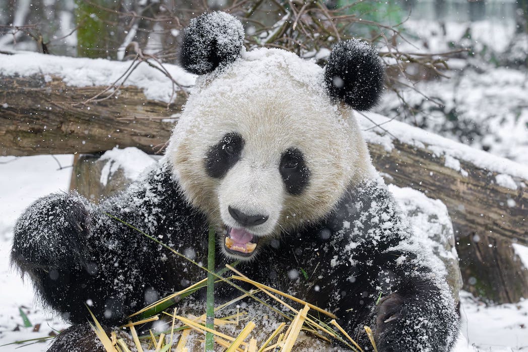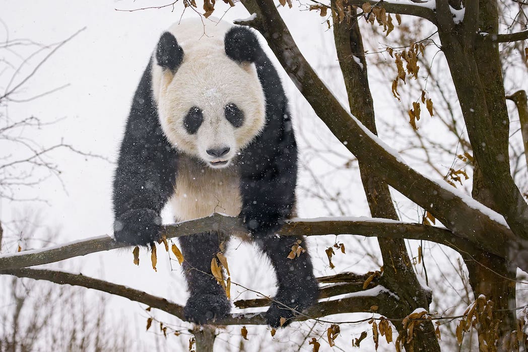 Vom gemächlichen Panda-Dasein mit Fressen und Schlafen ist an einem verschneiten Wintertag keine Spur. Vielmehr wird auf den winterlichen Baumstämmen geklettert und sich im Schnee gewälzt. Auf den ersten Blick sind dann nur noch die schwarzen Flecken um die Augen der Tiere im Schnee auszumachen.