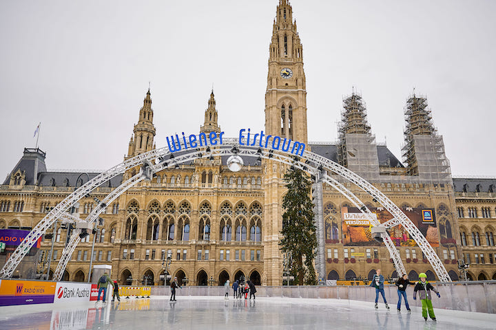 Der Wiener Eistraum vor dem Wiener Rathaus (Österreich) gehört wohl zu einem der idyllischsten Eislaufplätze dieser Welt. Der 27. Wiener Eistraum lockte von Mitte Jänner bis Mitte März 2022 mit einer 9.500 großen Eisfläche (größer als je zuvor) eine viertel Millionen Menschen zum Eislaufen auf den Rathausplatz. Eine zusätzliche Plattform auf dem Sky Rink im ersten Stock bot den BesucherInnen einen traumhaften Ausblick auf die idyllische Beleuchtung und die romantischen Eispfade im Rathauspark.