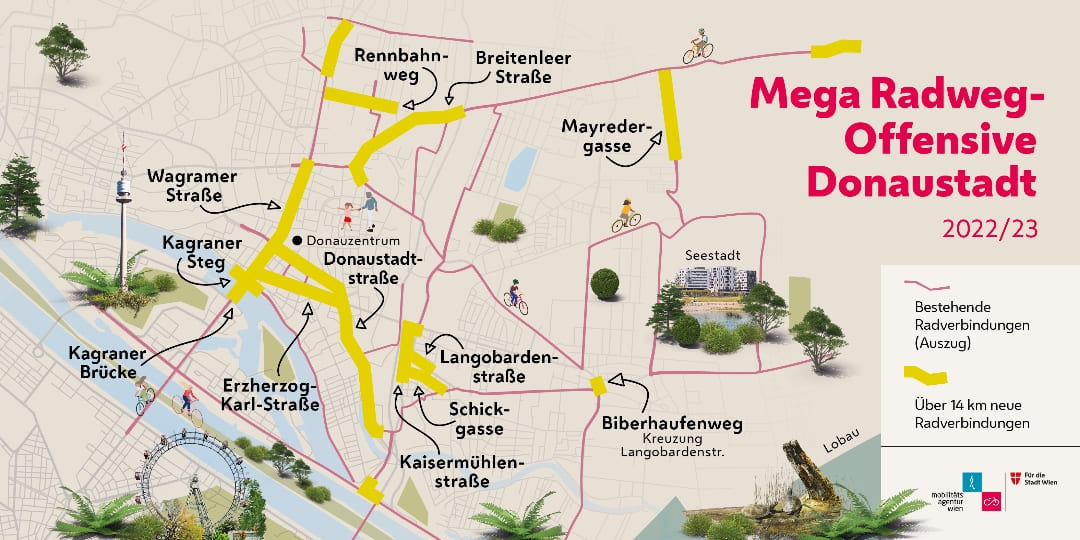 Für die 200.000 EinwohnerInnen der Wiener Donaustadt (Österreich) steht schon bald das Hauptradwegnetz mit insgesamt rund 14 Kilometern Radfahrwege zur Verfügung. Die Stadtvertreter sprechen von der größten Radwegoffensive in der Geschichte der Donaustadt. Zum Beispiel können die Radfahrer ab 2023 vom Kagraner Platz bis ins Stadtzentrum von Wien bequem über Wiens ersten Mega-Radhighway düsen. Mehr über