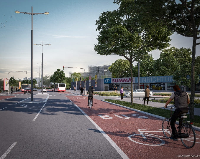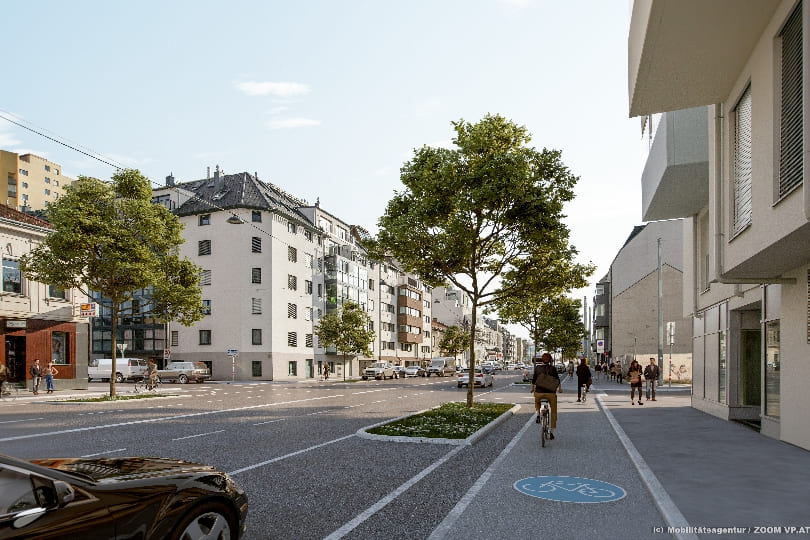 Um den DonaustädterInnen, die sich in neuen Wohnbauten entlang der Breitenleer Straße ansiedeln, gleich von Beginn an eine klimafreundliche Mobilität zu ermöglichen, wird die Straße umgestaltet und mehr als 40 Bäume gepflanzt.