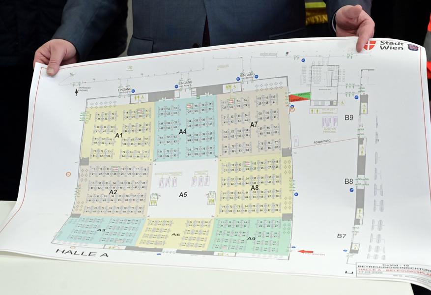 Die Stadt Wien hat in der 15.000 Quadratmeter großen Halle A der Messe Wien ein Betreuungszentrum mit 880 Betten für an Corona-Virus erkrankte Menschen eingerichtet. In der Messe Wien sollen die an Covid-19-Erkrankten, die milde oder moderate Krankheitsverläufe aufzeigen und in Heim-Quarantäne müssen, aber aus unterschiedlichen Gründen nicht können, von medizinischen Fachkräften betreut werden.
