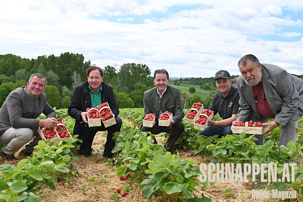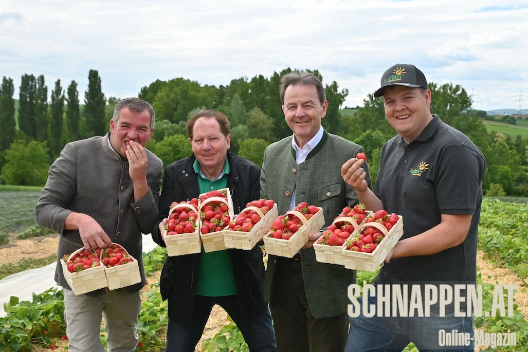 Erdbeerkönigin Nathalie I., Erdbeerbauer Christoph Ramhofer, Präsident der burgenländischen Landwirtschaftskammer Nikolaus Berlakovich und Bürgermeister Matthias Weghofer läuteten am 20. Mai 2022 offiziell die Erbeersaison in Wiesen im Burgenland (Österreich) ein. Mehr über
